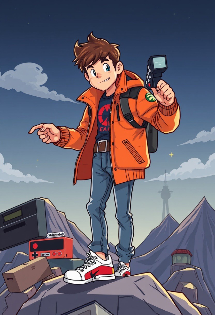 cartoon style, good definition, A young man with a marty mcfly jacket with a sega control belt ajeans nd old nike tenis raisign a nintendo zapper over a mountain made with old videogames cartidge