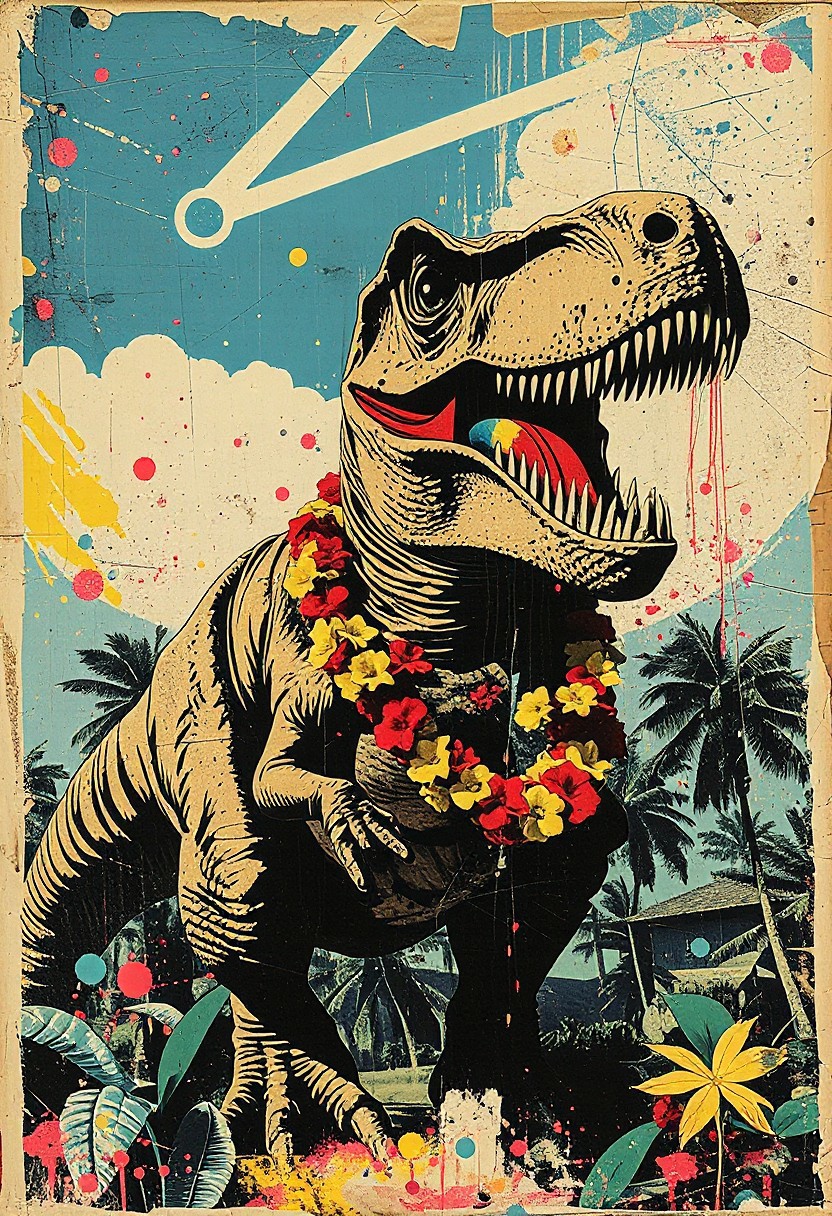 A pop art mixed media collage artwork style of Butcher Billy. Deconstructed, provocative, surreal, intense and chaotic composition. Street art textures, overlapping layers and vibrant retro colours. A punk stencil photocopy print of a magazine image of a friendly tyrannosaurus rex wearing a patterned Hawaiian shirt and lei flower necklace. In the background and comet roars through the sky. Print errors, halftone dots. grungy ink marks, and print registration errors. On top of this and partially covering it are layered sections of repetitive randomly coloured dots spraypainted in Yayoi Kusama style - smears and spray. Torn vintage photos of hula girls glued to the layers. Overlaying this are multiple layers of hand-drawn shapes and patterns, bold paint splashes, and chaotic magazine picture cutouts and clippings of Moai tiki heads, monstera leaves and lei necklaces. These, along with layers of paint splattered and dripping break up the outline. On the top layer are rough hand-drawn shapes, abstract patterns and love hearts and smileys scrawled heavy-handedly in blue biro and Sharpie marker.