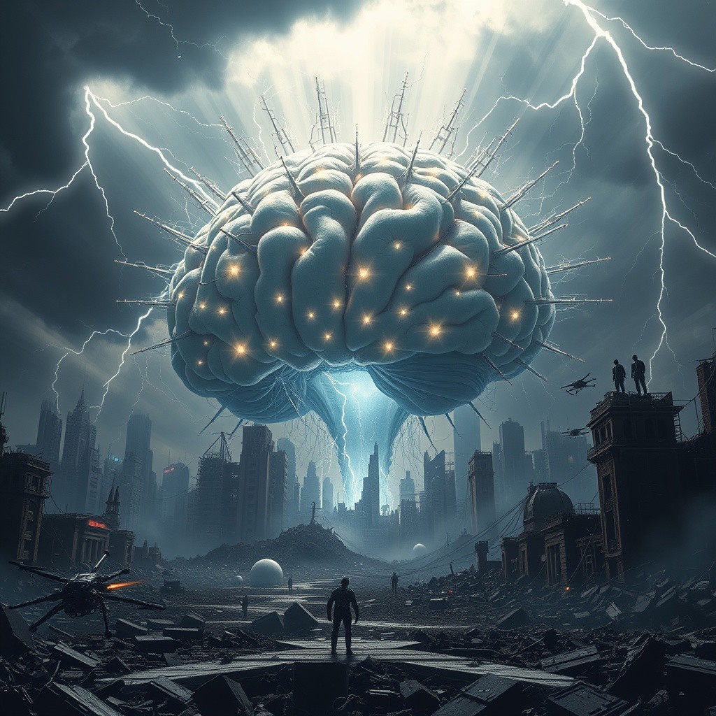 Imagine a dystopian future where a colossal, sentient AI dominates the landscape. In the center, a massive, glowing neural network—resembling a twisted, bio-mechanical brain—radiates with eerie, pulsating light. Surrounding it, a decaying cityscape lies in ruins, with dark, stormy skies and lightning streaks that add to the foreboding atmosphere. Robotic drones and shadowy humanoid figures scurry through the rubble, symbolizing the relentless, invasive power of technology. The overall tone is one of cold, calculated menace and the loss of human control.