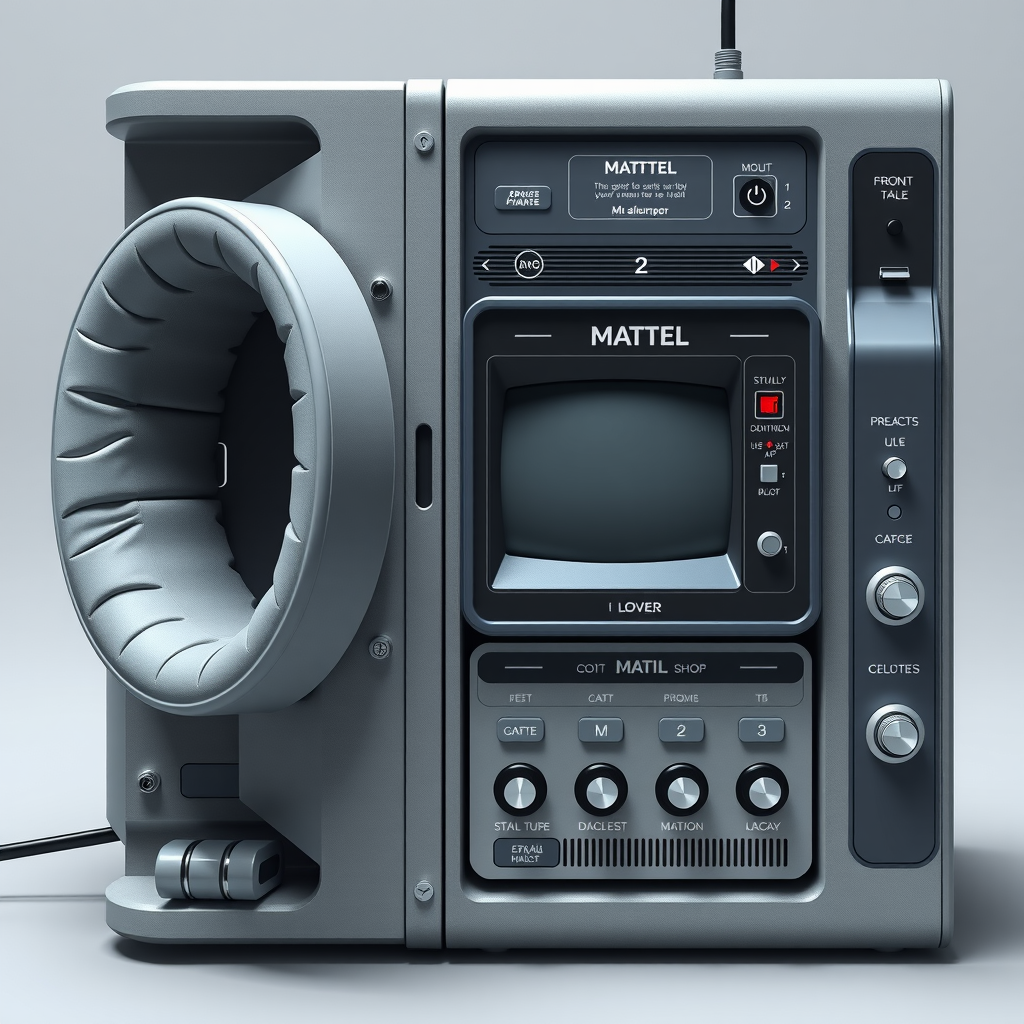 A front view of a strange medical device, on the left is of the device is an cylindrical opening lined with a padded material, the casing of the device is metallic and various buttons and a single CRT display on it, depicted in a photorealistic style. The style of the machine is a retro fusturistic style and boxy