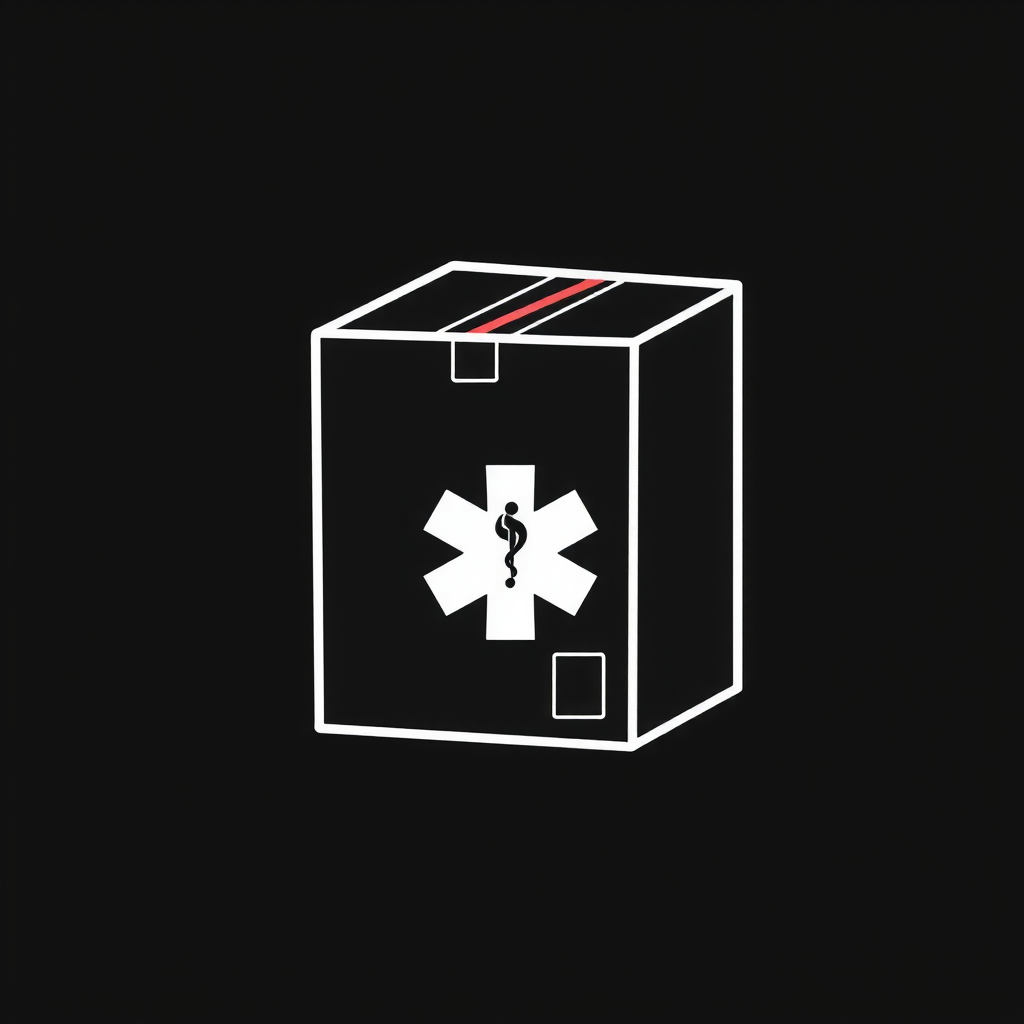 (stylized 2D, vector art), (schematic representation of an cardboard box with a medical symbol), (solid colors, thick-linework), white outline, black background, cardboard box with a medical symbol white in the center, black background, HDR, UHD, overall design is square, the design is only in black and white and minimalist in style