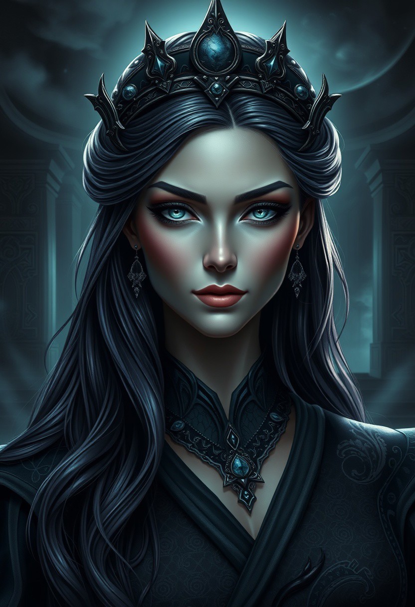 A dark goddess with a haughty yet exquisitely beautiful face, perfectly symmetrical features, piercing cold glowing eyes, delicate arched brows, and a slight arrogant smile. Her hair is long, flowing, dark with hints of purple or deep blue, adorned with an elegant yet ominous diadem. She wears luxurious dark robes with intricate patterns and celestial motifs. Background: a gloomy temple or a stormy night sky. Dramatic lighting highlights her figure. Style: dark fantasy, highly detailed, with elegant and beautiful facial features