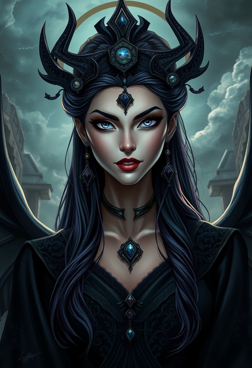 A dark goddess with a haughty yet exquisitely beautiful face, perfectly symmetrical features, piercing cold glowing eyes, delicate arched brows, and a slight arrogant smile. Her hair is long, flowing, dark with hints of purple or deep blue, adorned with an elegant yet ominous diadem. She wears luxurious dark robes with intricate patterns and celestial motifs. Background: a gloomy temple or a stormy night sky. Dramatic lighting highlights her figure. Style: dark fantasy, highly detailed, with elegant and beautiful facial features