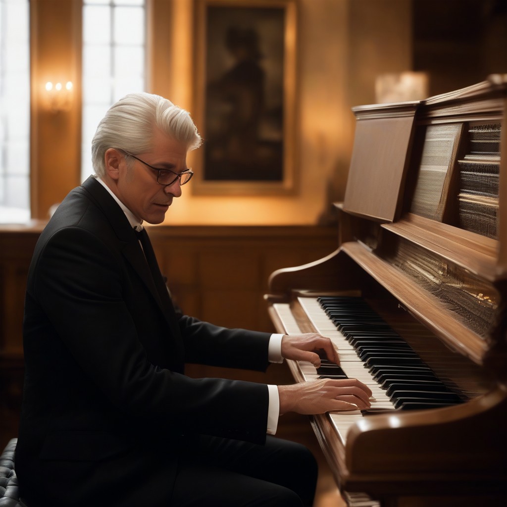 "A young man with black and white hair, elegantly playing a beautifully crafted wooden organ. He is dressed in a stylish black suit with a refined presence. His fingers move gracefully over the organ keys, deeply immersed in the music. The warm glow of ambient lighting reflects on the polished wooden surface of the instrument, enhancing the cozy yet dramatic atmosphere. The background is softly blurred, creating a focus on the musician and his expressive performance. The scene has a fantasy-inspired, cinematic feel with a blend of realism and artistic lighting."