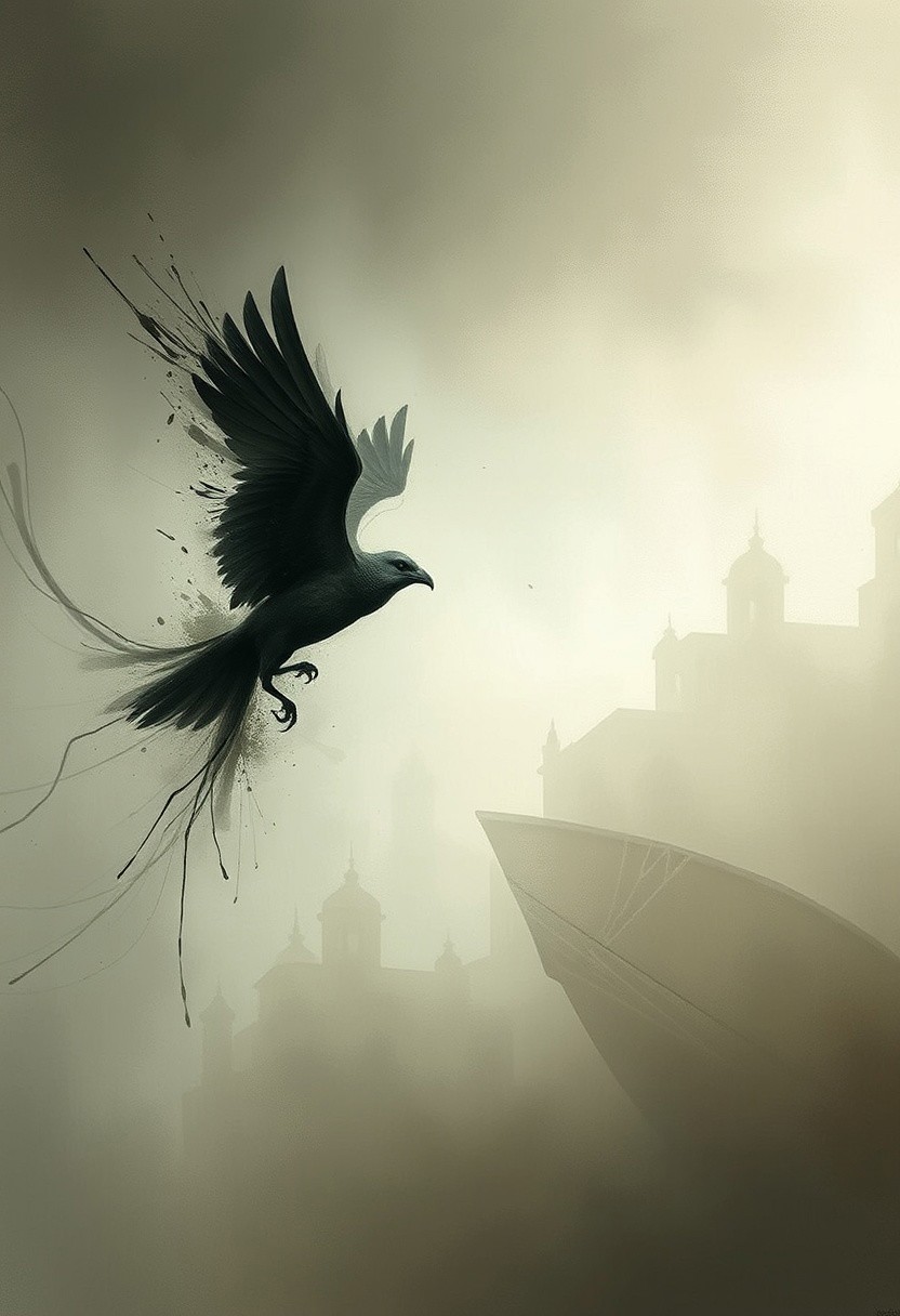 A bird taking flight, its wings dissolving into abstract marks, evoking a sense of freedom and movement , surreal atmospheric fantasy, misty vast landscapes, dreamlike realism, floating objects, lone mysterious figures, symbolic surrealism, poetic stillness, soft diffused lighting, intricate painterly textures, deep muted color palette, enigmatic surreal dreamscape