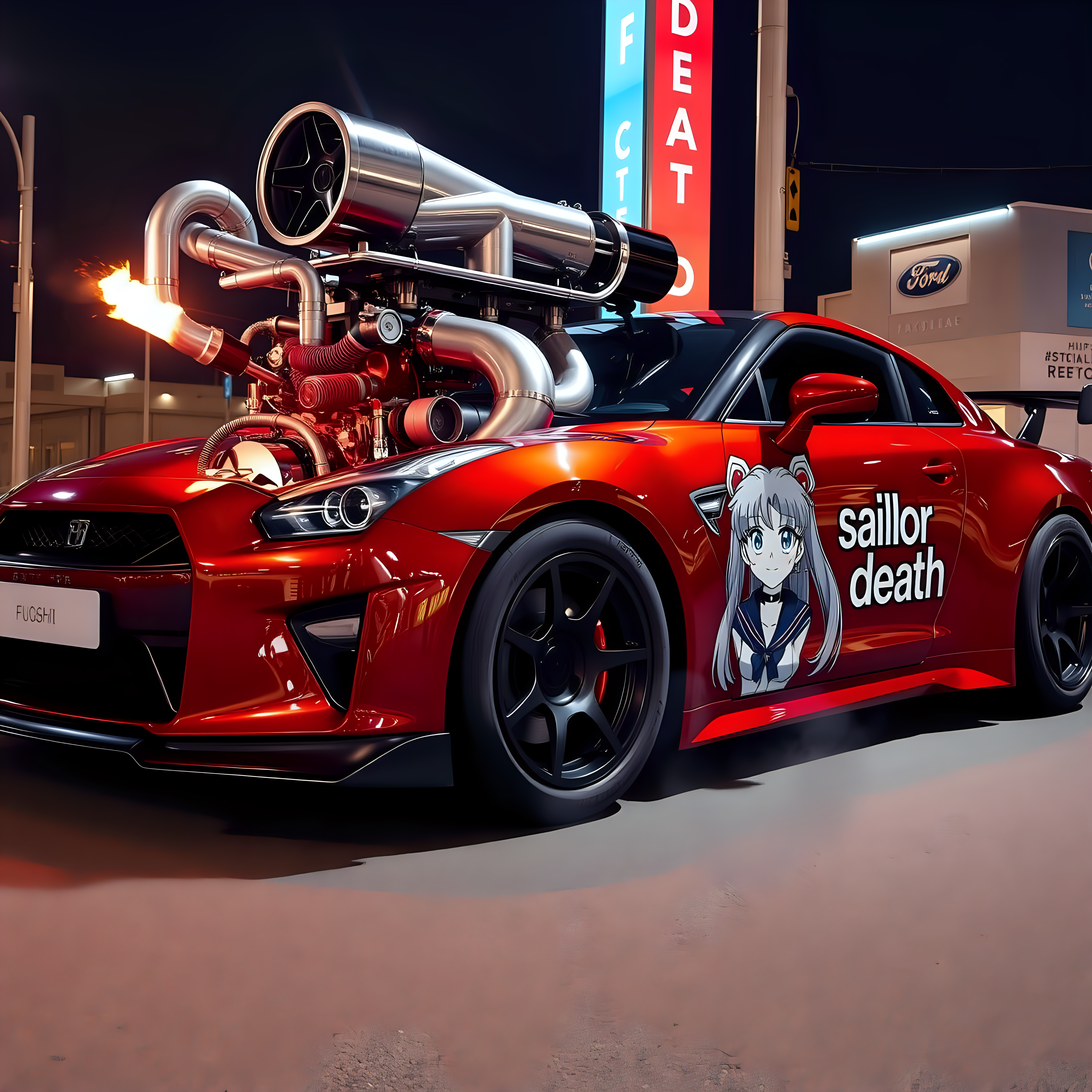 A monstrous, heavily modified japanese gtr sports car with an V8 engine so massive it barely fits under the hood. The supercharger and blower tower over the car, chrome-plated and roaring with power, with thick intake pipes and exposed mechanical parts and timing belts. Fire burst with black smoke from the side exaust pipes as the car idles aggressively. The front end is low and mean, with a custom grille and reinforced bumper. The rear tires are oversized, gripping the asphalt as the car prepares to launch. The setting is a gritty urban street at night, neon lights reflecting off the red polished metal. black Smoke rises from the tires, and the drawing of a (sailor moon girl) and bold text "sailor death" are painted on the side panel. The atmosphere is pure adrenaline and raw horsepower.