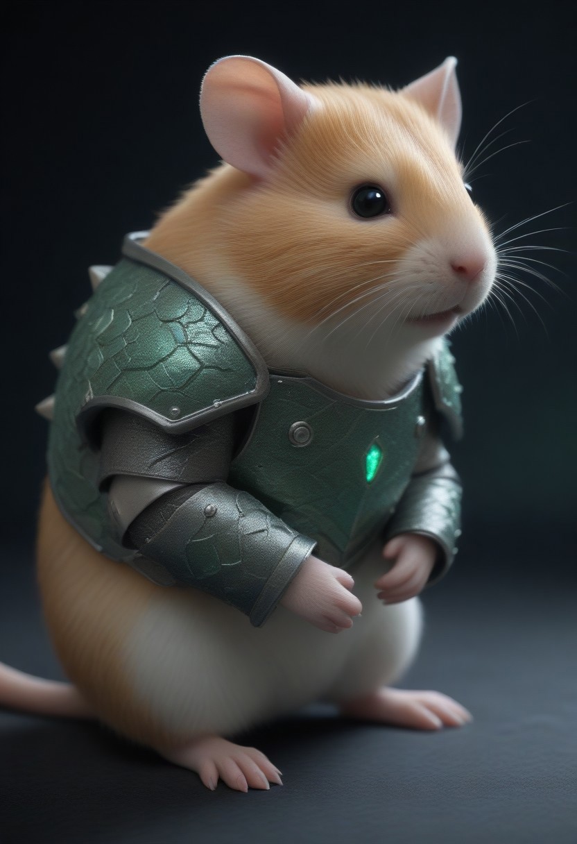 animal, armored hamster, intricate scales, novuschroma54 style armor plating, glowing gemstone embedded in bracer, slit pupils, futuristic design, green energy accents, reinforced metallic structure, detailed textures, high-tech aesthetic, cinematic lighting, dynamic pose, fantasy cybernetic fusion