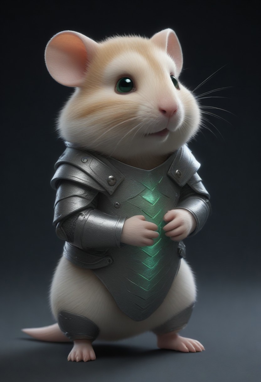 animal, armored hamster, intricate scales, novuschroma54 style armor plating, glowing gemstone embedded in bracer, slit pupils, futuristic design, green energy accents, reinforced metallic structure, detailed textures, high-tech aesthetic, cinematic lighting, dynamic pose, fantasy cybernetic fusion