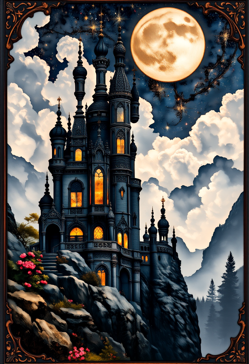 ArsMJStyle, art nouveau, magnificent, intricate details, painting of haunted castle, full moon night, eerie flowers, steep rocky slopes