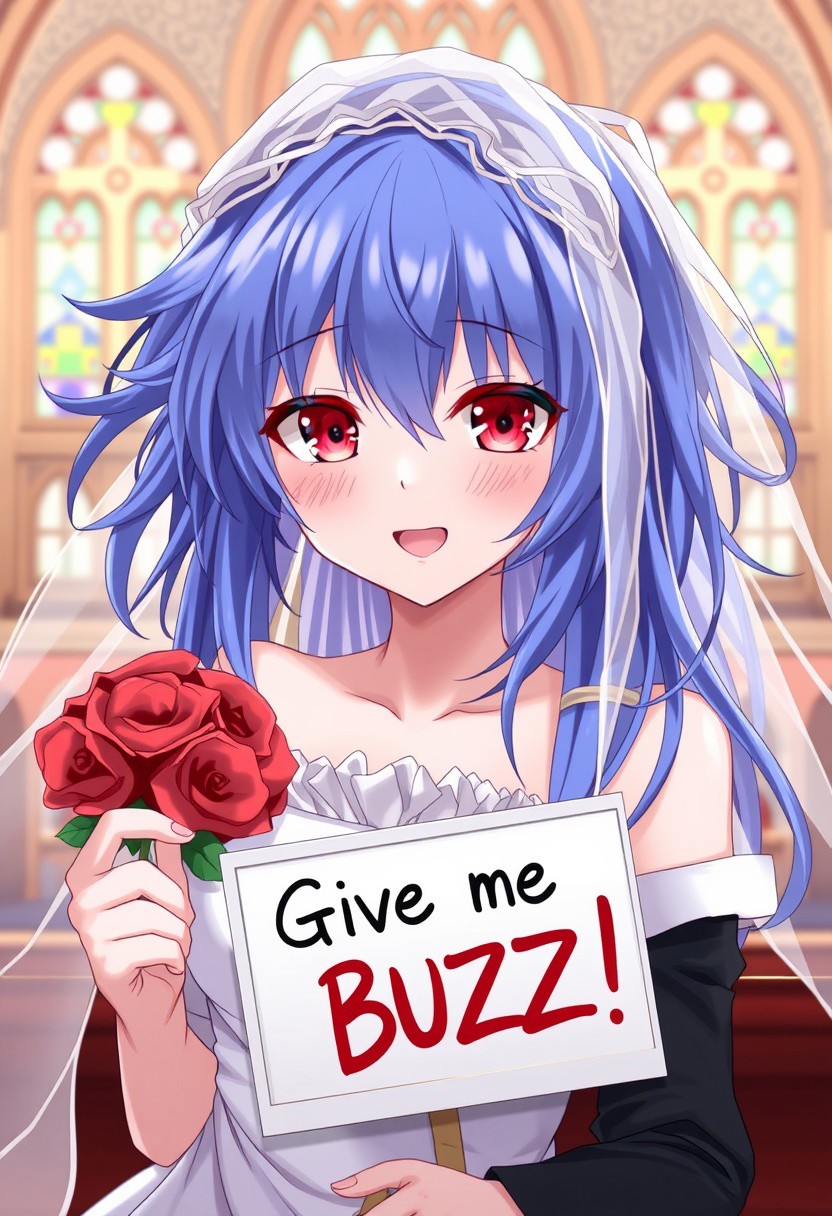score_4,score_5,score_6,score_7_up,score_8_up,score_9 ((masterpiece,best quality,ultra detailed,highres,HD,4k:1.2)), 1 girl,solo,face focus, 1 girl,solo,face focus, ayanami_rei,rei ayanami, blue hair, ((long hair, Messy Hair:1.2)),red eyes, head gear, large huge breast, Wedding, church, wedding dress, wedding veil, (("Give me Buzz.",Beggars Borad,Holding a sign, holding a sign that says, "Give me Buzz.")) looking at viewer,open mouth,blush,happy,smile,cheerful,