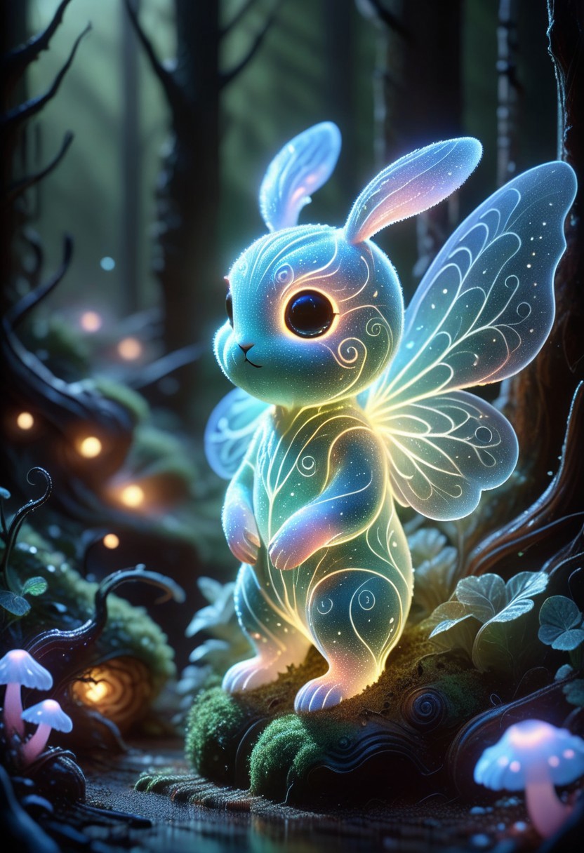 In an enchanted forest illuminated by soft twilight, a creature named Cabbelle is depicted. Cabbelle has a small, fluffy rabbit body and iridescent dragonfly wings. The wings display shades of emerald green and pearlescent white, resembling the layered structure of a cabbage. Her eyes emit a golden glow, and she holds a tiny lantern shaped like a cabbage blossom in her paws. The surrounding forest features bioluminescent flora, including trees with stardust-like leaves and floating, luminescent cabbage-shaped mushrooms. The ground is covered in soft, glowing moss. Cabbelle's wings are patterned with intricate cabbage leaf veins, which refract light into a spectrum of colors. The scene is devoid of emotional descriptors, focusing solely on the visual and structural elements of the environment and the creature.
