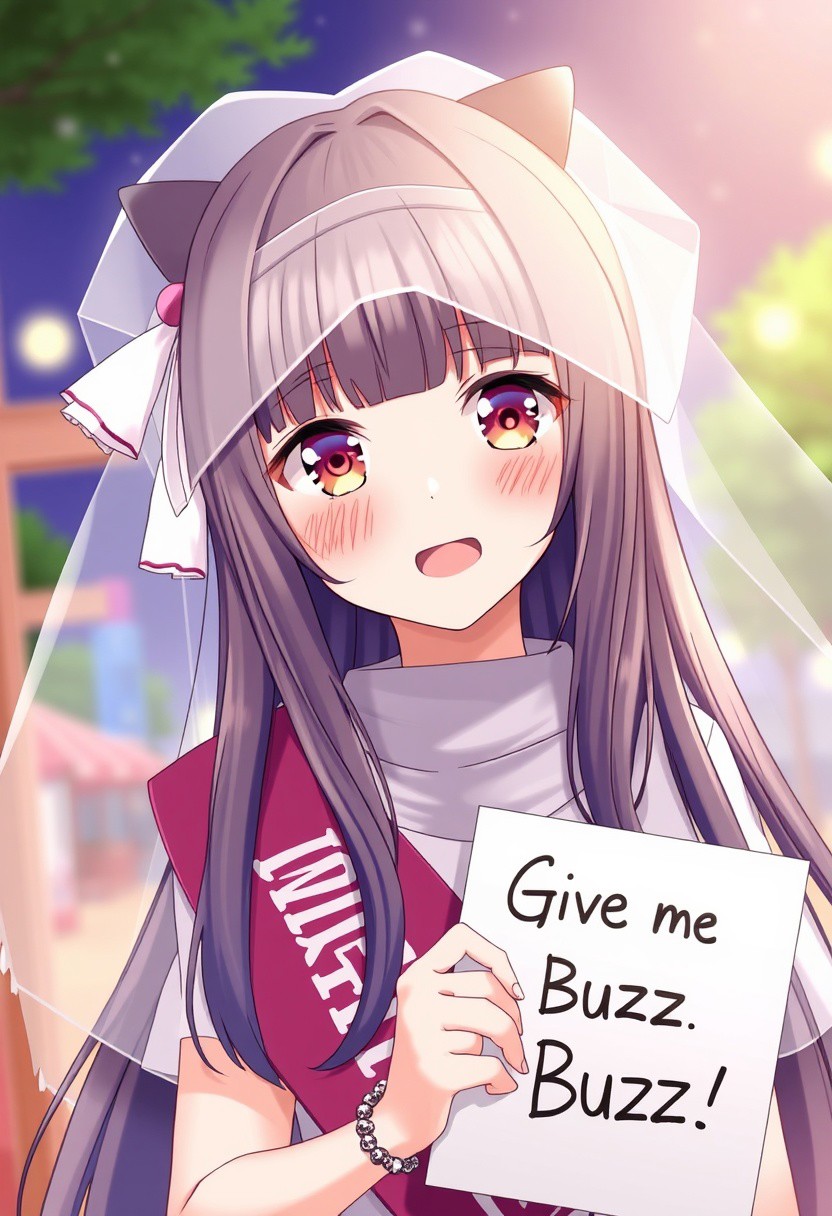 score_4,score_5,score_6,score_7_up,score_8_up,score_9 ((masterpiece,best quality,ultra detailed,highres,HD,4k:1.2)), 1 girl,solo,face focus, 1 girl,solo,face focus, mayuzumi fuyuko,fuyuko mayuzumi,,myzmfyk, long hair, black hair, two side up, blunt bangs, brown eyes, dress,sash,veil,see-through,jewelry,bracelet,ring, (("Give me Buzz.",Beggars Borad,Holding a sign, holding a sign that says, "Give me Buzz.")) looking at viewer,open mouth,blush,happy,smile,cheerful,