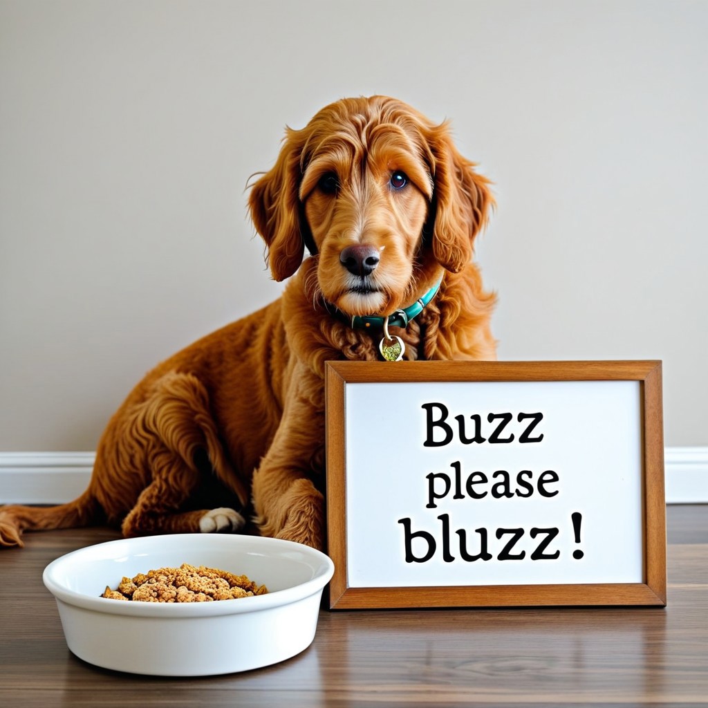 Golden doodle next to an (((empty))) dog bowl holding a sign with text "buzz please", buzz