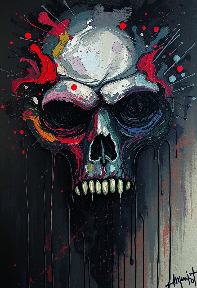 An eerie creepy abstract expressionist artwork using dark tones and unsettling details. The piece features vibrant color splashes, thick impasto textures, gestural brushstrokes, dynamic negative space, and artistic lighting.