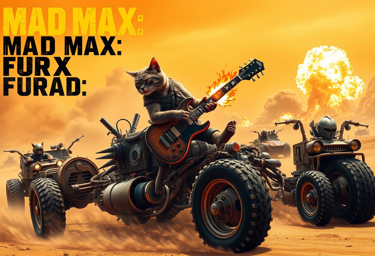 "MAD MAX: FURRY ROAD"—Bold, gritty, cinematic title emblazoned across the top, styled like a blockbuster movie poster. A wild, post-apocalyptic desert showdown à la Mad Max: Fury Road, reimagined with feral anthropomorphic cats. Center stage: a battle-hardened tabby cat, scarred and fierce, decked in shredded leather and steampunk goggles, perched atop a monstrous war rig. It shreds a flaming electric guitar, unleashing a fiery blast skyward, fur thrashing in the wind, tail slashing the air, eyes glowing with unhinged fury. The war rig—spiked, chained, and rigged with blaring speakers—thunders across the wasteland, trailed by a convoy of armored vehicles driven by manic feline war boys. Dust swirls in towering clouds, the orange sky pulses with heat haze, and distant explosions light up the horizon. Ragged banners snap from rusted poles as agile cat warriors leap between speeding rigs, claws out, locked in savage combat. The scene screams motion, fire, and raw, adrenaline-soaked insanity.