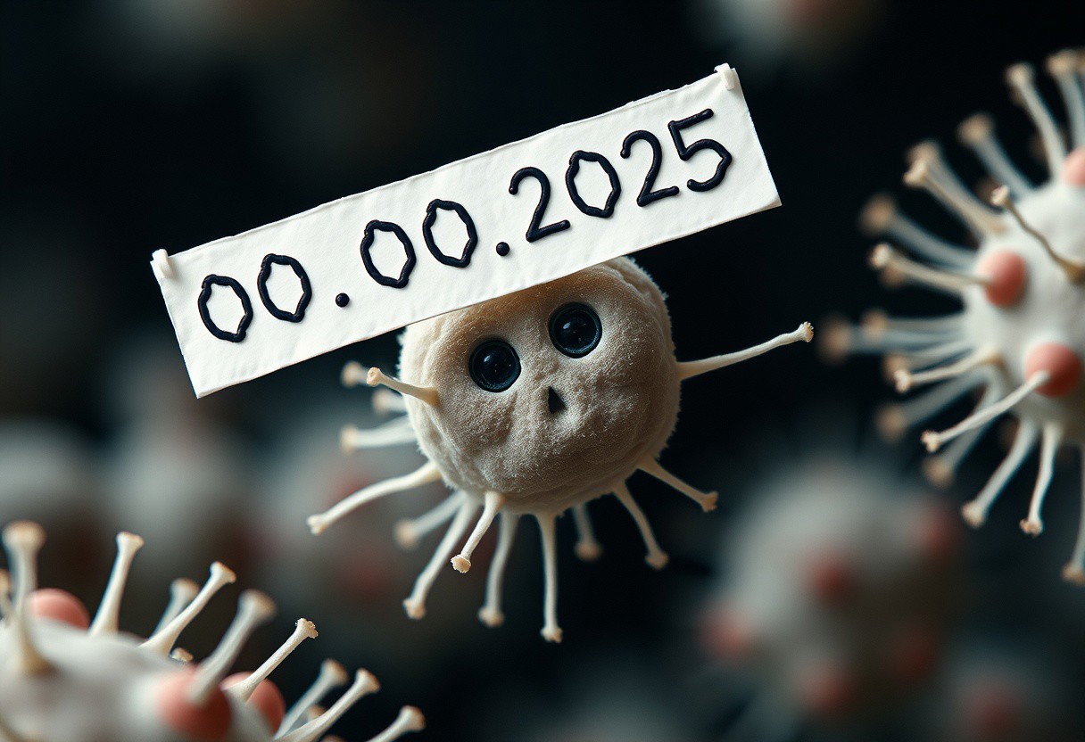 Microscopic view, bacteria is holding a banner that says "00.00.2025 00:00"
