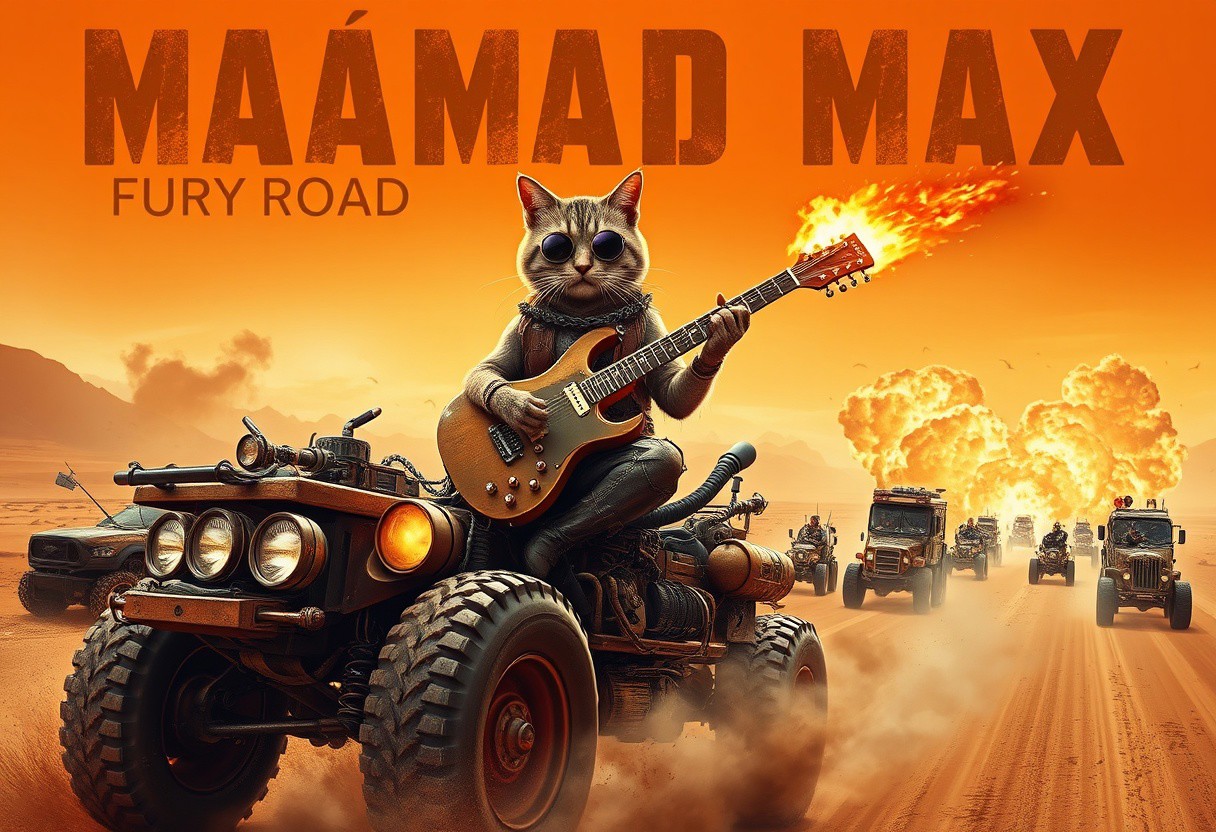 "MAD MAX: FURRY ROAD"—Bold, gritty, cinematic title emblazoned across the top, styled like a blockbuster movie poster. A wild, post-apocalyptic desert showdown à la Mad Max: Fury Road, reimagined with feral anthropomorphic cats. Center stage: a battle-hardened tabby cat, scarred and fierce, decked in shredded leather and steampunk goggles, perched atop a monstrous war rig. It shreds a flaming electric guitar, unleashing a fiery blast skyward, fur thrashing in the wind, tail slashing the air, eyes glowing with unhinged fury. The war rig—spiked, chained, and rigged with blaring speakers—thunders across the wasteland, trailed by a convoy of armored vehicles driven by manic feline war boys. Dust swirls in towering clouds, the orange sky pulses with heat haze, and distant explosions light up the horizon. Ragged banners snap from rusted poles as agile cat warriors leap between speeding rigs, claws out, locked in savage combat. The scene screams motion, fire, and raw, adrenaline-soaked insanity.