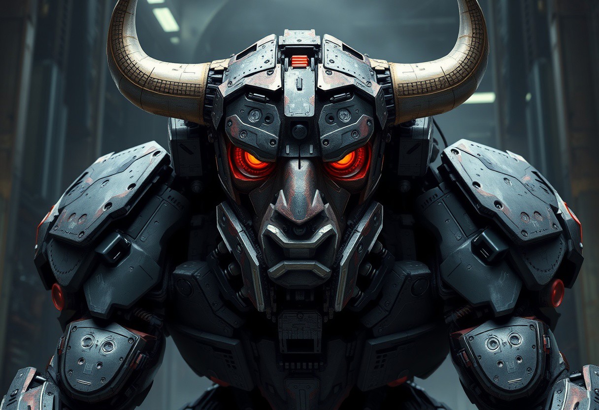 Create a close-up illustration of a robot with a broken, ruined armored core trunk, flexing large muscles, set against a dark factory background of mass production. The image should resemble a bull, with a focus on perfect symmetrical balance and golden ratio proportions. Incorporate elements of dark matter incarnate and thunderstrike, with a cyberpunk aesthetic inspired by the art of Baiōken Eishun and MC Escher. The style should be photorealistic, with extremely fine details and a chiaroscuro lighting effect. The image should be rendered in 8K resolution with a high level of realism, similar to an Unreal Engine illustration. Incorporate the likeness of Tom Selleck, with a focus on intense, dramatic expression.