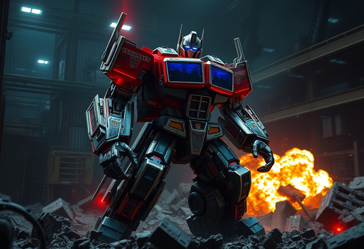 Generate a cinematic, high-detailed image of a mecha fused with Optimus Prime in a dark factory setting, emphasizing hyper-realism. Incorporate lasers, explosions, and rubble to enhance the atmosphere. Utilize Redshift rendering with unreal engine settings for an 8K, HD output with micro and lifelike details.