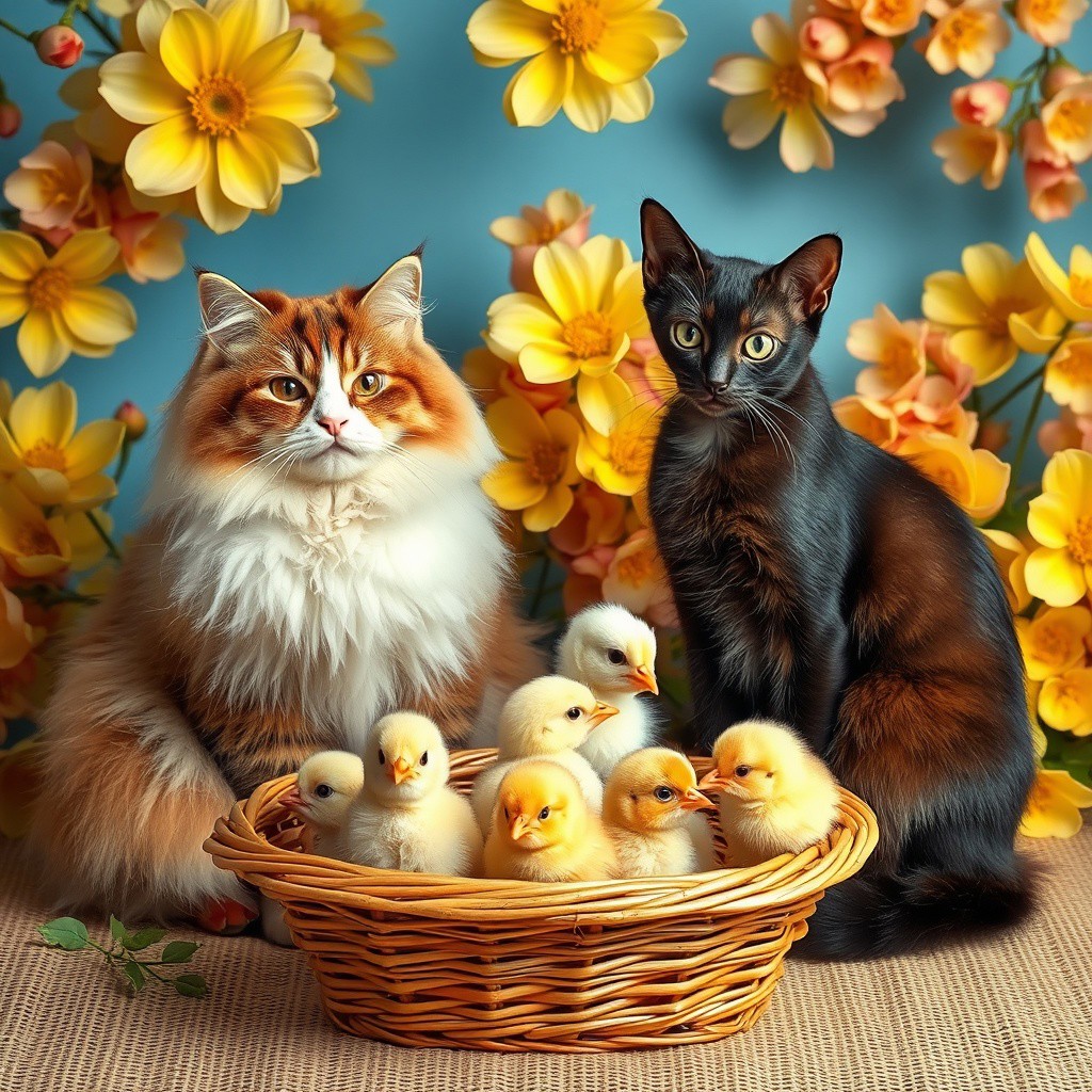 Create an image featuring two cats—one fat and fluffy, the other thin and graceful—sitting against a backdrop of bright mimosa flowers. In front of them is a basket with cute chicks peeking out, curiously looking around. The cats are watching the chicks with interest, creating an atmosphere of playfulness and friendliness