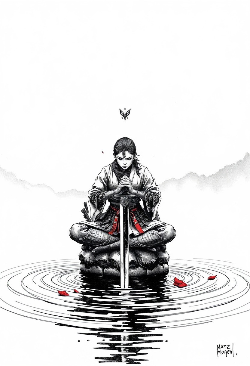 A lone warrior meditating on a foggy lake, her sword resting on the surface, as waves ripple with unseen energy hyper-detailed black-and-white ink illustration, high-contrast ballpoint pen realism, cyberpunk and punk aesthetics, traditional Japanese elements, sharp cross-hatching, dark humor and satire, intense facial expressions, edgy fashion, minimal red accents, beauty and brutality contrast