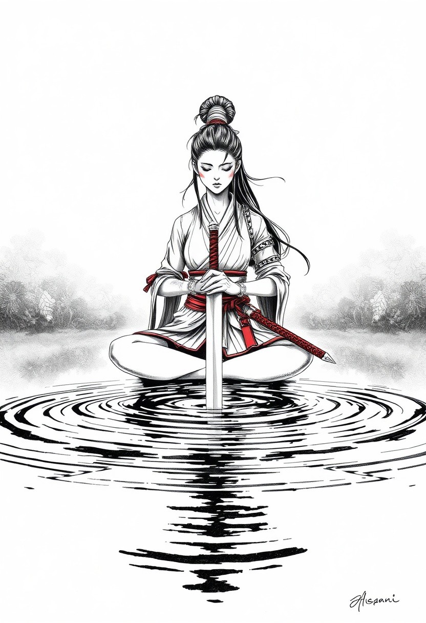A lone warrior meditating on a foggy lake, her sword resting on the surface, as waves ripple with unseen energy hyper-detailed black-and-white ink illustration, high-contrast ballpoint pen realism, cyberpunk and punk aesthetics, traditional Japanese elements, sharp cross-hatching, dark humor and satire, intense facial expressions, edgy fashion, minimal red accents, beauty and brutality contrast