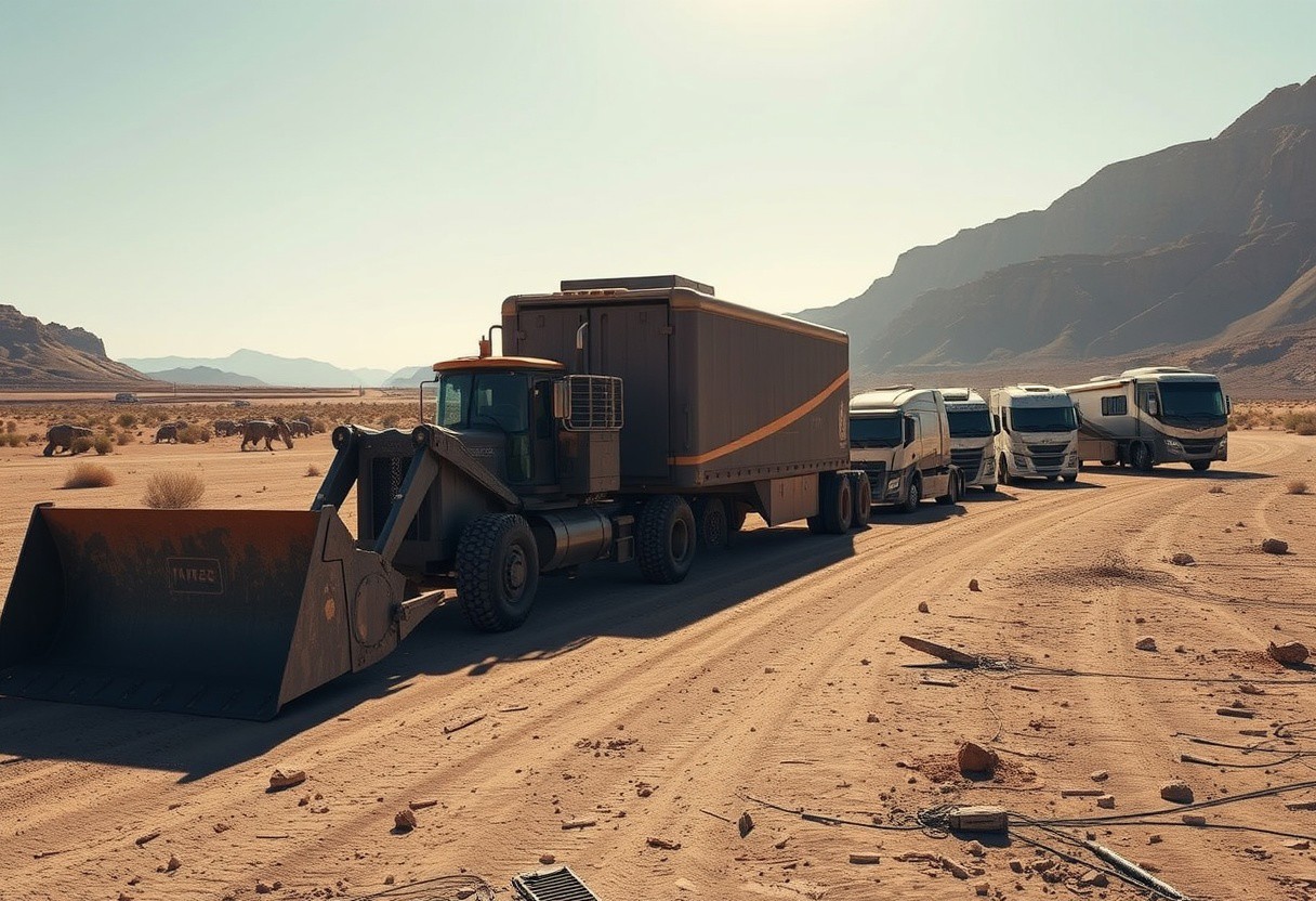 the caravan snaked its way along a dead riverbed, the sun glinting off of the collection of futuristic and high-tech trucks & trailers, hovercraft, and mechs. A sci-fi bulldozer with a large blade in the front was in the lead of the caravan followed by 4 trucks with trailers, and in the end three hover RVs.