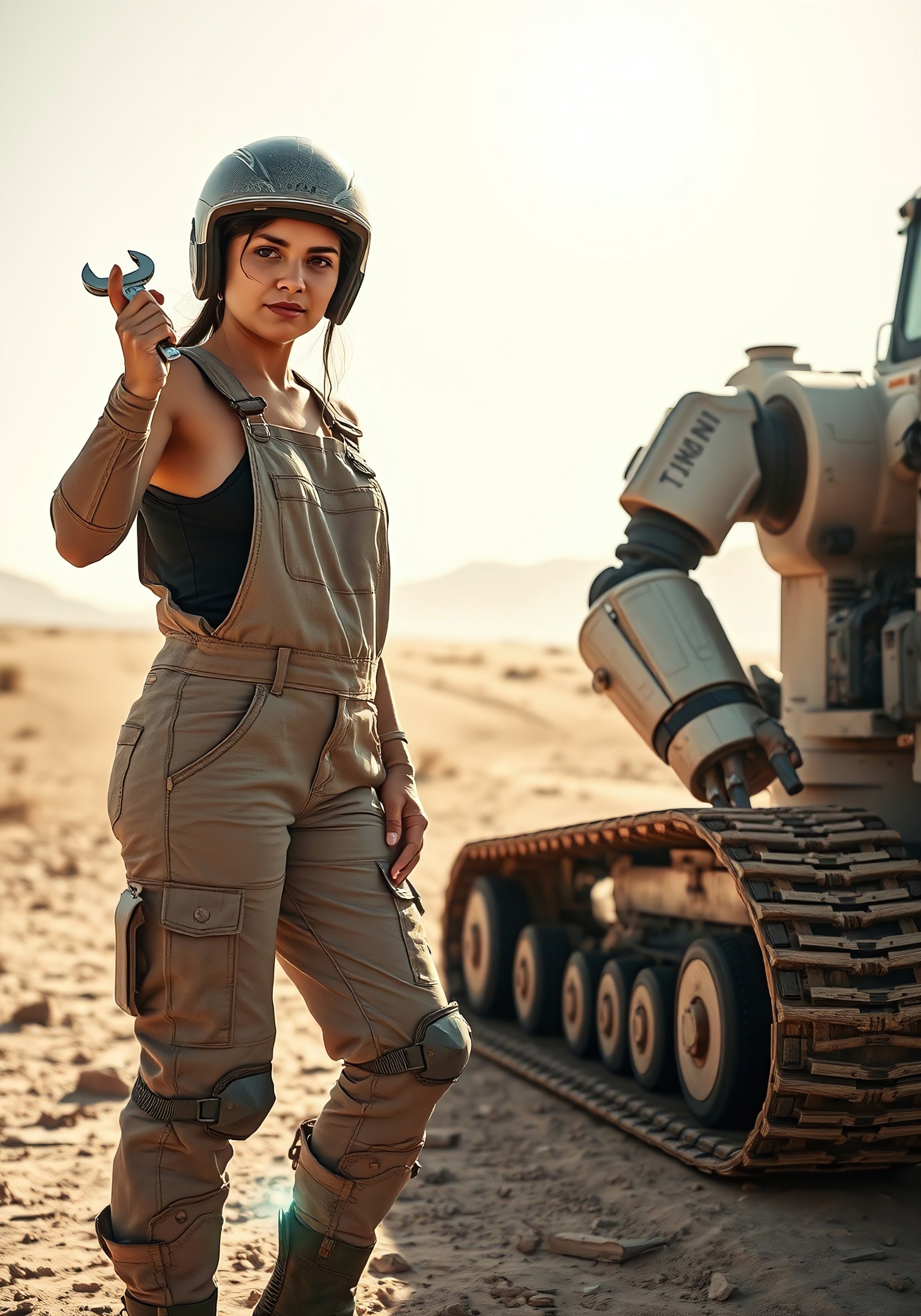 An attractive young hispanic woman stands in the desert. She is looks at the camera as she works on a large tracked machine. She is wearing overalls with armor and is holding a wrench in her left hand. The landscape is dusty with the sun brightly shining over the barren desert landscape. She is fully clothed and NOT wearing a helmet. Next to her is a large armored robot assistant holding tools.