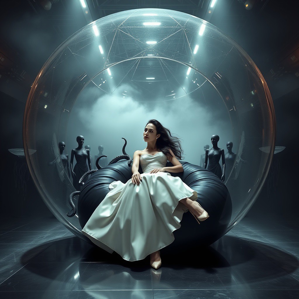 Ethereal, raven-haired Norwegian socialite, clad in a sumptuous, silk satin wedding gown and stiletto heels, laying in giant black glossy ring satin pillow, ensnared within a gargantuan, crystalline jelly dome, its translucent walls glistening with an otherworldly sheen, as if infused with an extraterrestrial essence. Tentacles, like ghostly fingers, wrap around her lithe form, emerging from the depths of a fog-shrouded abyss, while a coterie of black, Victorian-era mannequins, draped in tattered, luxurious ball-gowns, stand as silent witnesses, frozen in a tableau of macabre elegance. Above, a blindingly intense light beam illuminates the scene, casting an eerie glow upon the polished steel floor, which seems to stretch on forever, like a catwalk into the very abyss of madness. The atmosphere is heavy with foreboding, as if the very fabric of reality is about to unravel, revealing the dark, labyrinthine recesses of a long-abandoned, cosmic horror. Inspired by the surreal, biomechanical visions of H.R. Giger, the eerie, atmospheric lighting of Roger Dean, and the masterful, cinematic storytelling of Ridley Scott, this haunting, live-action film still is a testament to the transcendent power of cinematic art, with its meticulously crafted, 35mm film aesthetic, replete with subtle, film grain textures, and a rich, color graded palette, evoking the very essence of a bygone era, lost in the depths of space and time.
