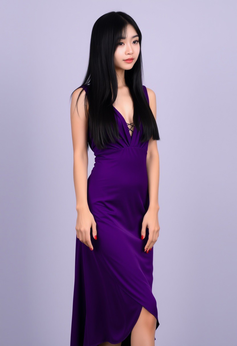 A 19-year-old Taiwanese woman with long straight black hair, wearing a purple deep V-neck sleeveless dress and purple high-heeled open-toed sandals. FHD, Rich in details, masterpiece.