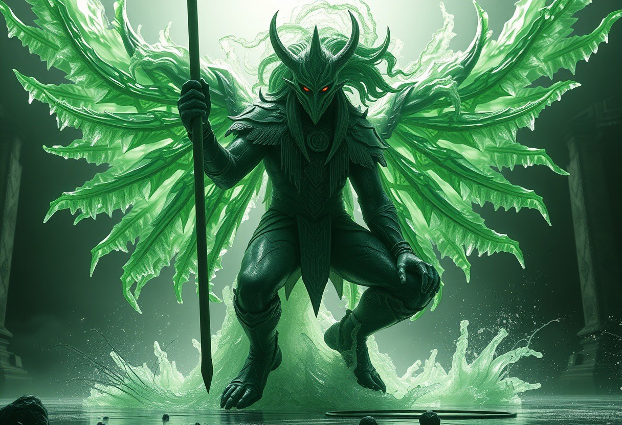 Create a hyper-detailed, 4K, HD image of a Celtic Guardian transforming into his final form on a Dark Factory of Mass Production backdrop. Incorporate ice needles, heavy green coloration, and an official details render aesthetic reminiscent of a trending Instagram image. The scene should feature a portcullis, pointé pose, open mouth, and a liquid headdress with a shockwave effect. Primarily focus on the golden ratio, micro details, lifelike details, and cinematic lighting typical of a flagship anime studio staff. The image should evoke a sense of a glorious, gorgeous nebula being born, specifically leveraging Octane render and post-processing techniques.