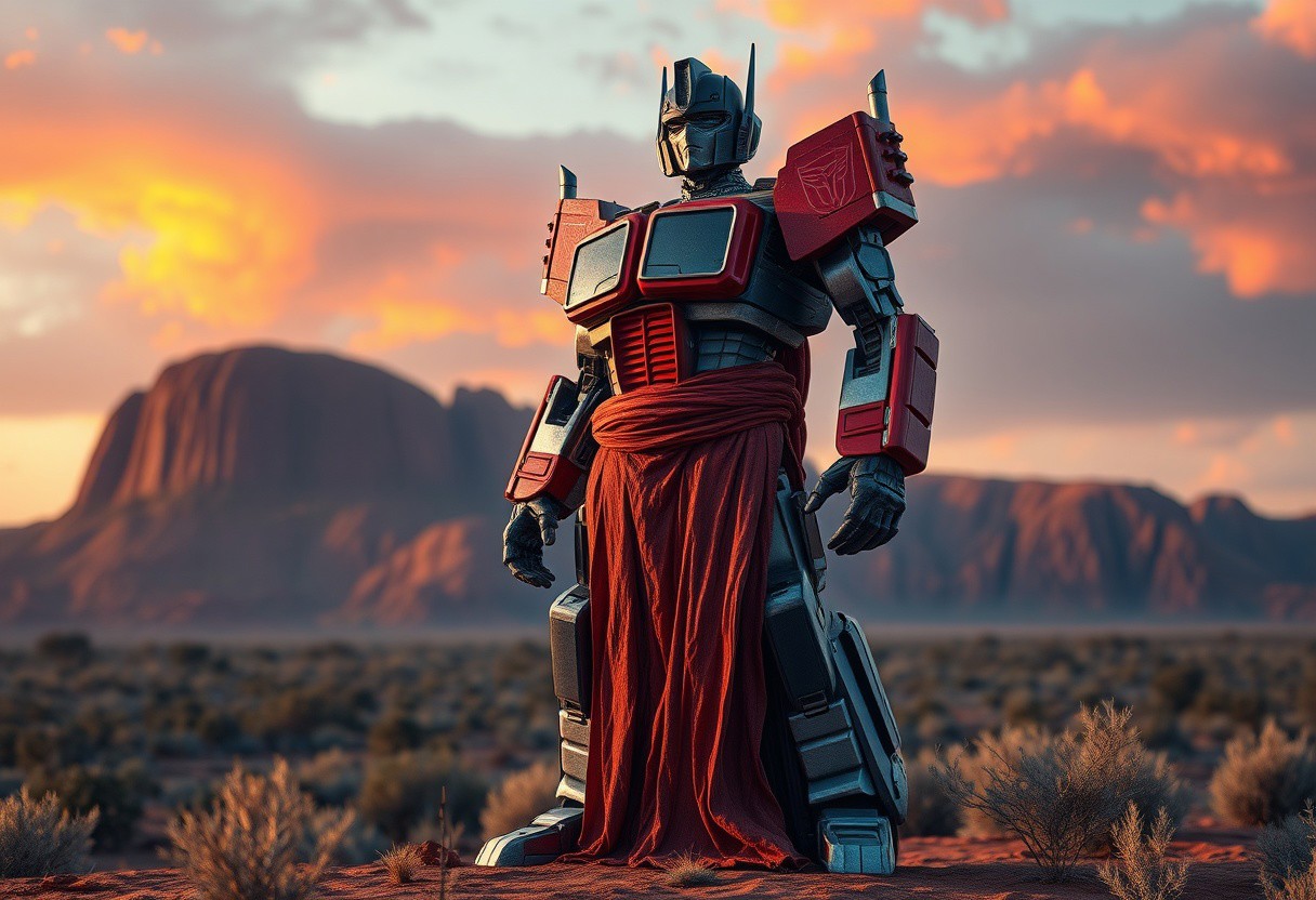 Create a highly detailed, 8K resolution image of Optimus Prime as an old man, specifically a robot Battle Footballer, with a robust, stocky body, wearing a long, tattered dress in red or blue hues, set against the breathtaking backdrop of an Ayers Rock sunrise. Implement a toon rendering style with tone mapping, subsurface scattering, and atmospheric effects. The image should exhibit lifelike details and follow the golden ratio. Use an Octane render with post-processing to achieve a hyper-detailed, HD photo quality finish.