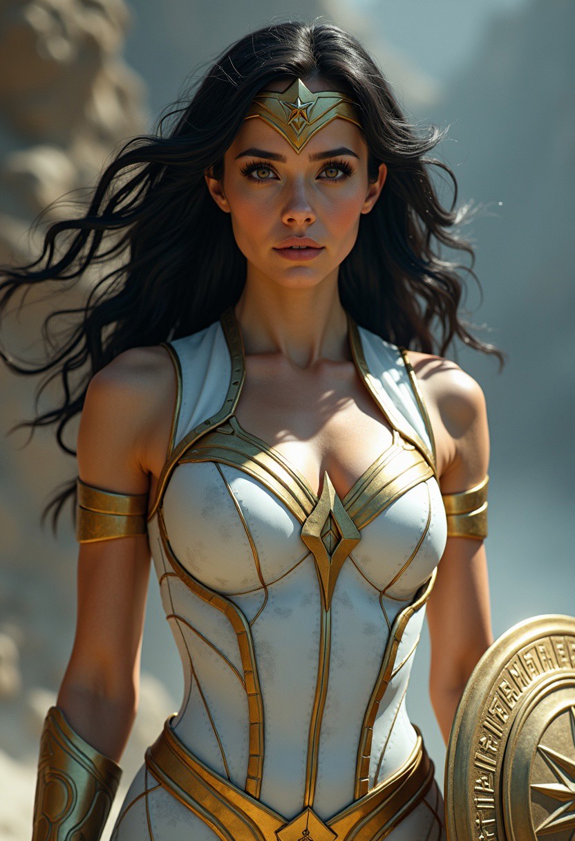 Cyber Anime sci-fi cinematic scenes. The beauty Wonder woman in suit. White and golden. The bodysuit, the Shield and sword with detailed runes,emblem on chest, (Ultra-realistic, 32k, Masterpiece, High Quality, Detailed Realistic Background, Official Art, Realistic Lighting, filmfotos, film grain, reversal film photography)