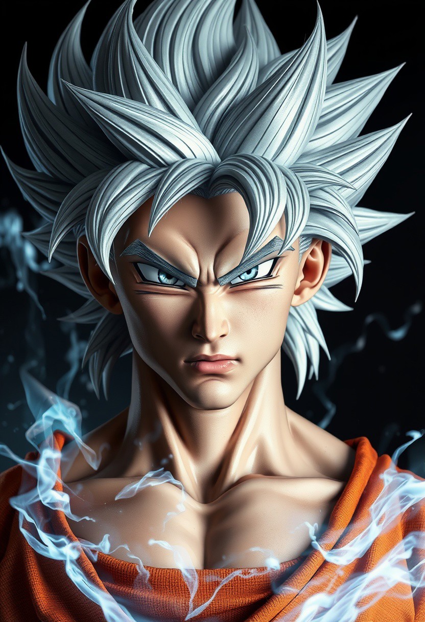 A realistic lifelike full body portrait of Goku in ultra instinct mode reimagined as a real person. with silver & white hair, silver aura around his body, intense look