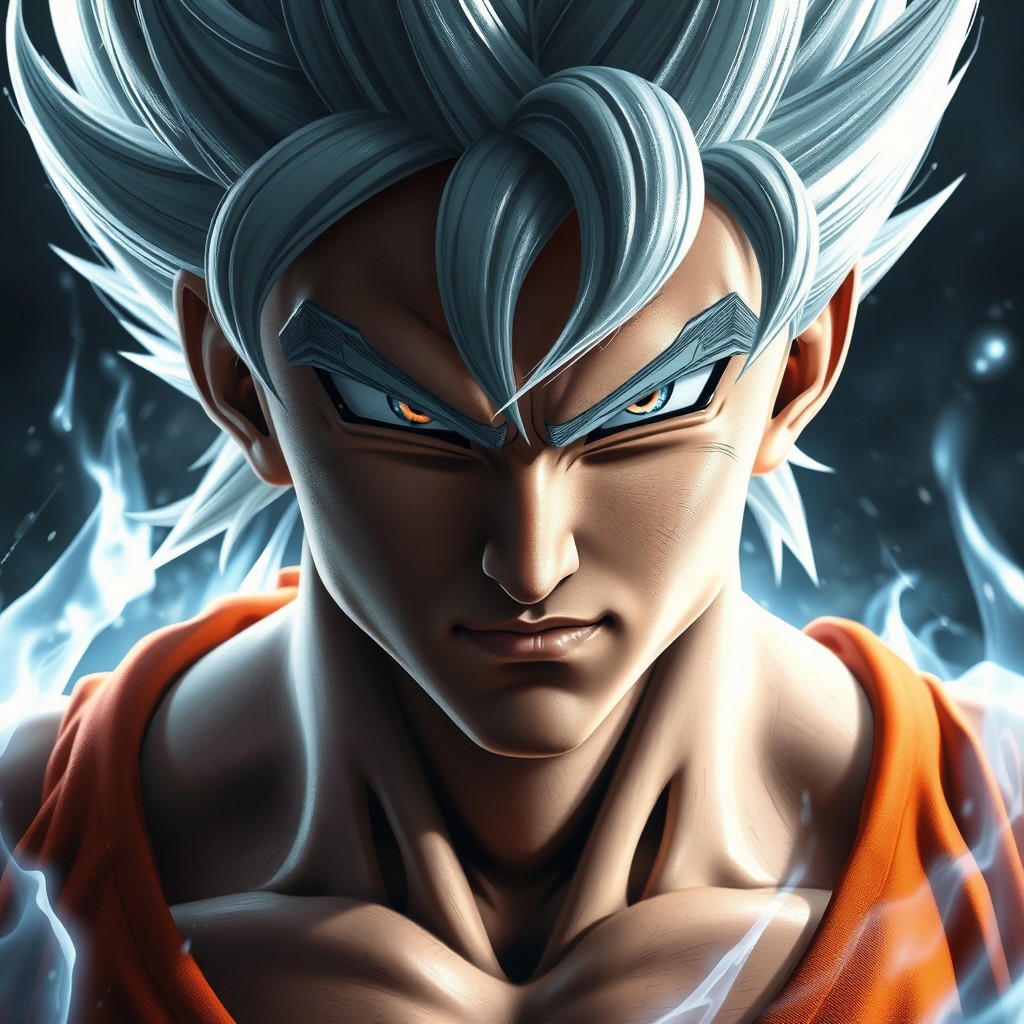 A realistic lifelike full body portrait of Goku in ultra instinct mode reimagined as a real person. with silver & white hair, silver aura around his body, intense look