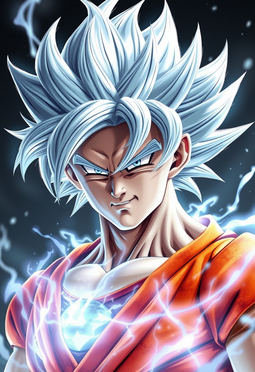 A realistic lifelike full body portrait of Goku in ultra instinct mode reimagined as a real person. with silver & white hair, silver aura around his body, intense look