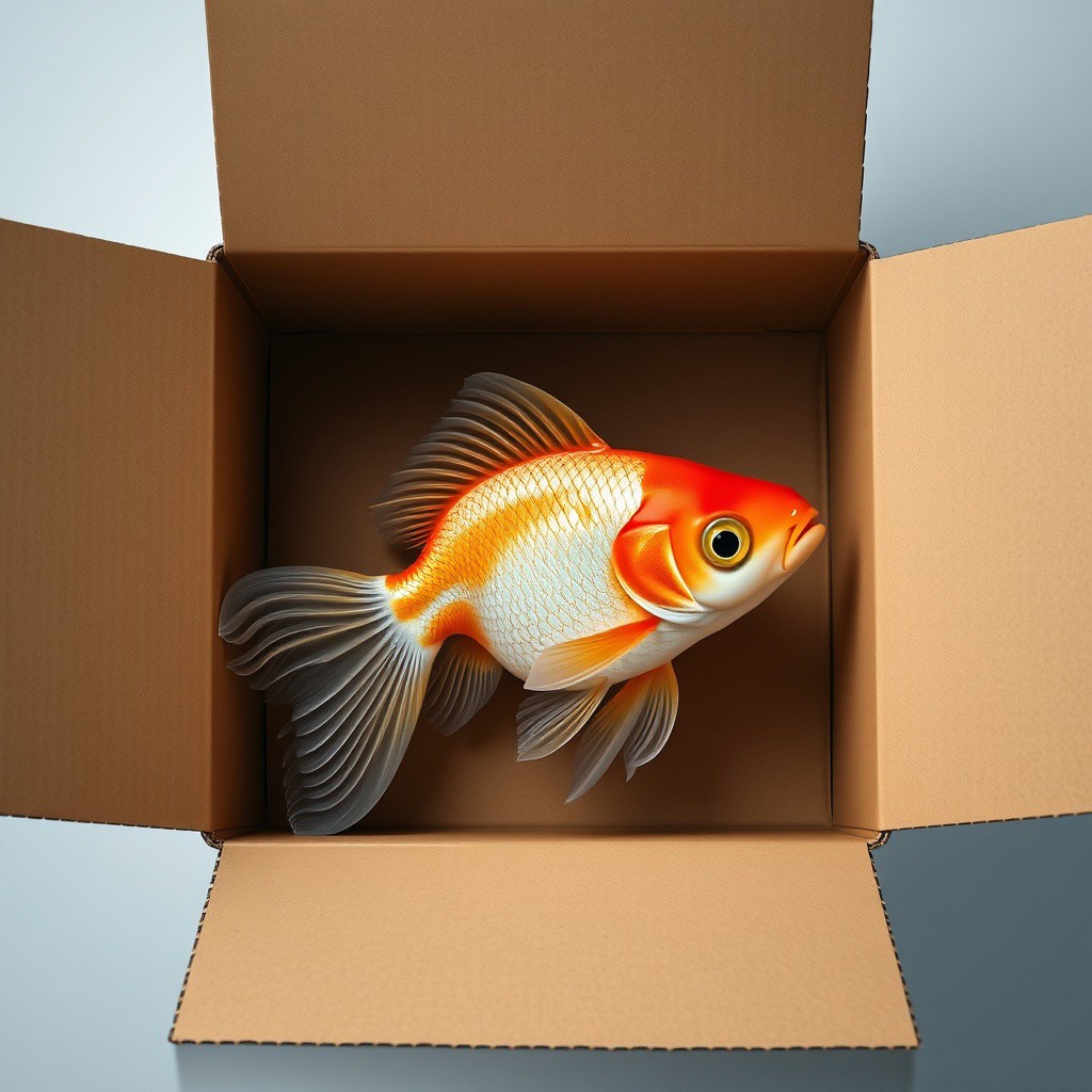 high quality, detailed, source_3d, source_photo, BREAK cardboard box, top down view of cardboard box, open box, goldfish laying on its side at the bottom of the box, goldfish is motionless, goldfish eye looking at view,