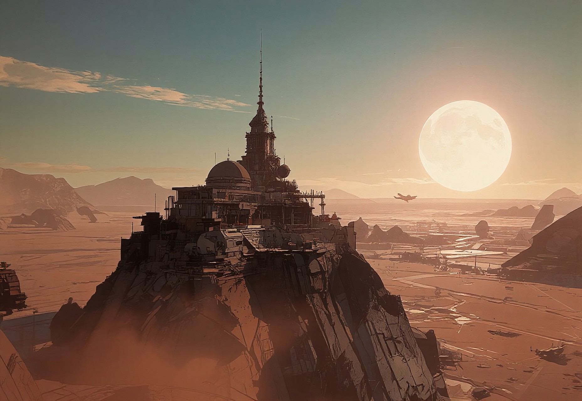 View from the sky of a futuristic city in the middle of a desert. The scene takes place on another planet, as two suns are visible in the sky. The futuristic city is perched on a very tall rocky spur. The city is beautiful and harmonious, made of glass and steel. A large building with a grand dome overlooks the city. In the distance, space and air traffic can be seen. The city is surrounded by a vast sandy desert. The sky is very bright because one of the two suns is setting.
