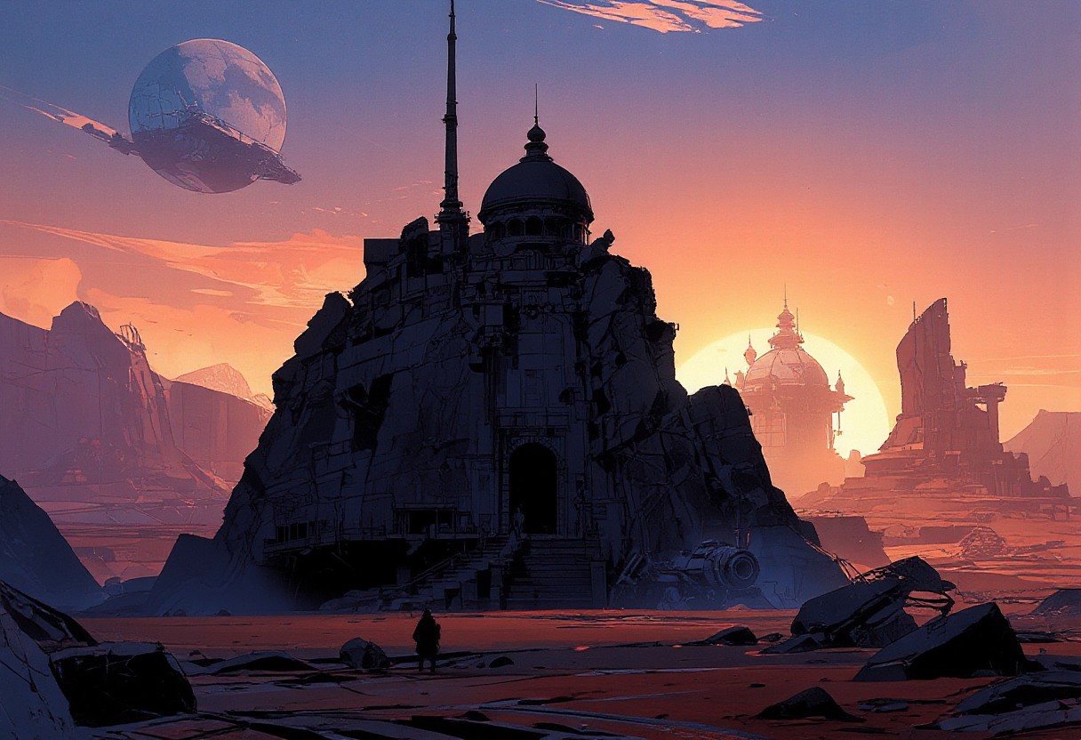 An ancient temple like Chtule temple, stands in the middle of a vast rocky desert. The scene takes place on another planet, as two moons are visible in the sky—one very large and the other smaller. The temple is perched on a massive rocky spur, carved directly into the stone. A colossal doorway leads into the depths of the rock. The temple is harmonious, built of stone, and exudes an air of ancient majesty. A large structure with a grand dome rises above the rock. Space traffic is visible, with a massive spaceship above and another below, docking at an astroport near the temple. Human activity is evident both at the astroport and in front of the temple. Several platforms extend from the rocky outcrop supporting the temple. In the distance, two other ancient temples can be seen, also clinging to rocky spurs. Nomads traverse the terrain, moving between the temples. The landscape is an immense desert of sand, occasionally punctuated by large rock formations. The sky is still bright as the sun sets, casting a stunning blend of deep blues and warm oranges. The image is beautifully composed, balancing the elements of the scene with masterful lighting and contrast. The sunset bathes the landscape in a dramatic glow, and careful attention is given to the projection of shadows, enhancing the depth and realism of the moment.