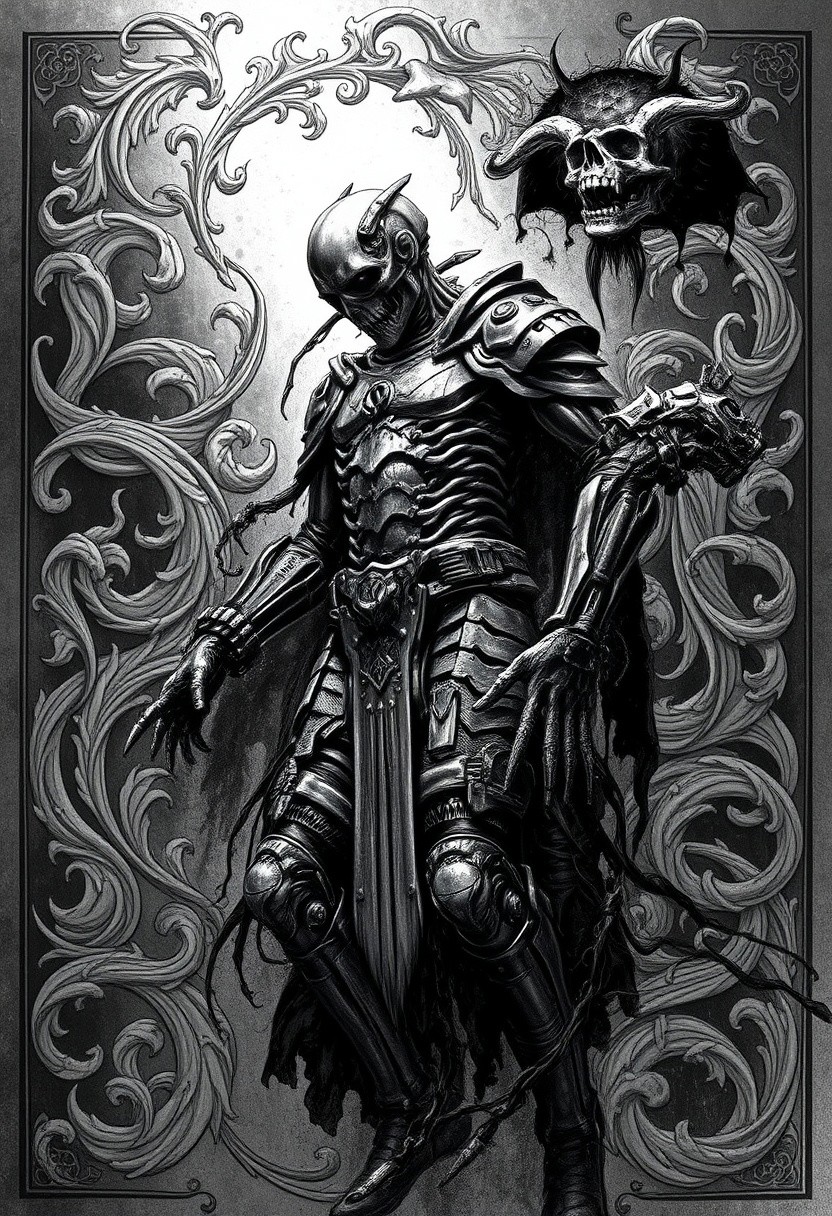 A ghostly figure of a fallen warrior, his body fractured between decayed armor and sleek cybernetic plating, surrounded by swirling engraved patterns that seem to come alive. The atmosphere is dark, foreboding, yet mesmerizing. dark fantasy, high-contrast, intense chiaroscuro, dynamic compositions, cybernetic warriors, baroque engraving details, dystopian aesthetics, intricate linework, grim and dramatic atmosphere, heavy shadows, surreal grotesque elements, futuristic armor, mythological themes, otherworldly creatures, expressive movement, gritty textures, black ink style, mechanical augmentation, gothic energy, battle-ready figures, otherworldly warfare