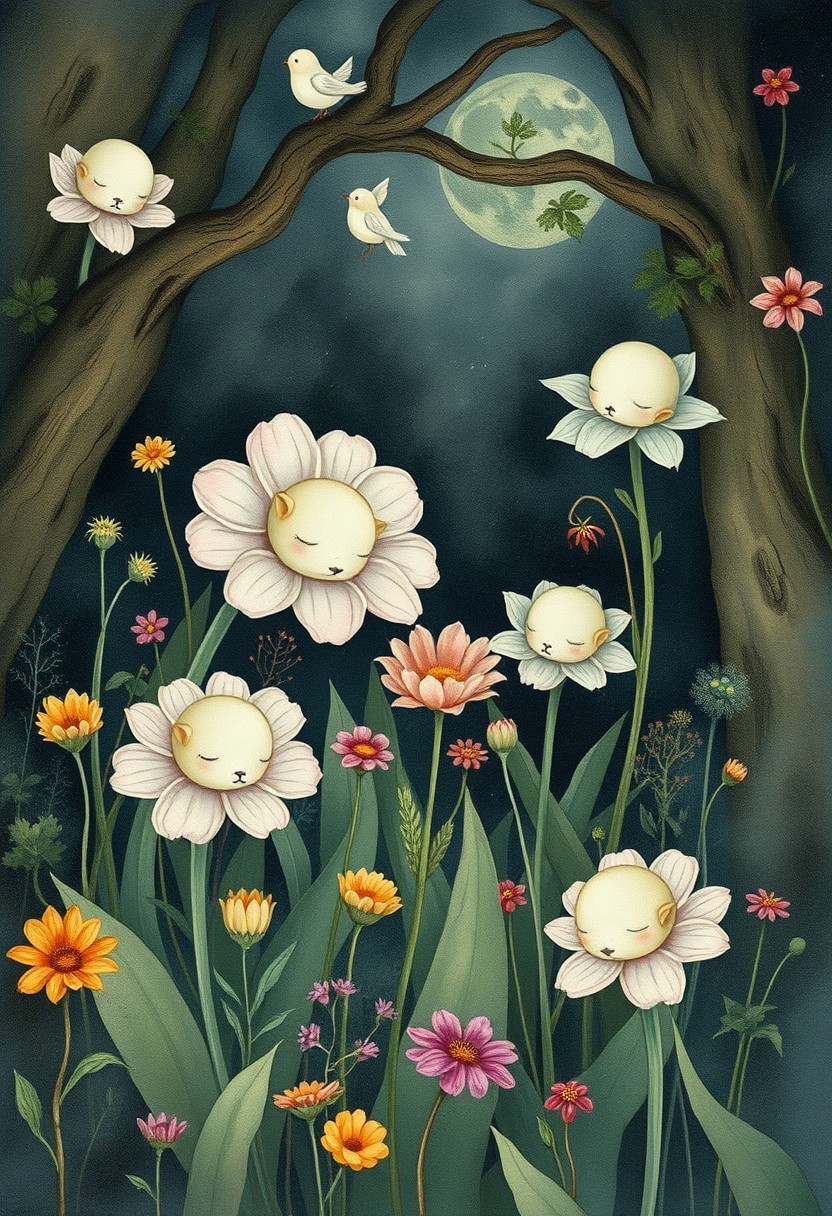 A hidden garden where the flowers resemble tiny, sleeping animal faces , whimsical yet surreal illustration, soft watercolor naturalism blended with eerie dreamlike symbolism, anthropomorphic animals in mysterious landscapes, delicate fine brushwork with hidden unsettling details, nostalgic storybook atmosphere with quiet surreal undertones, transformation and metamorphosis themes