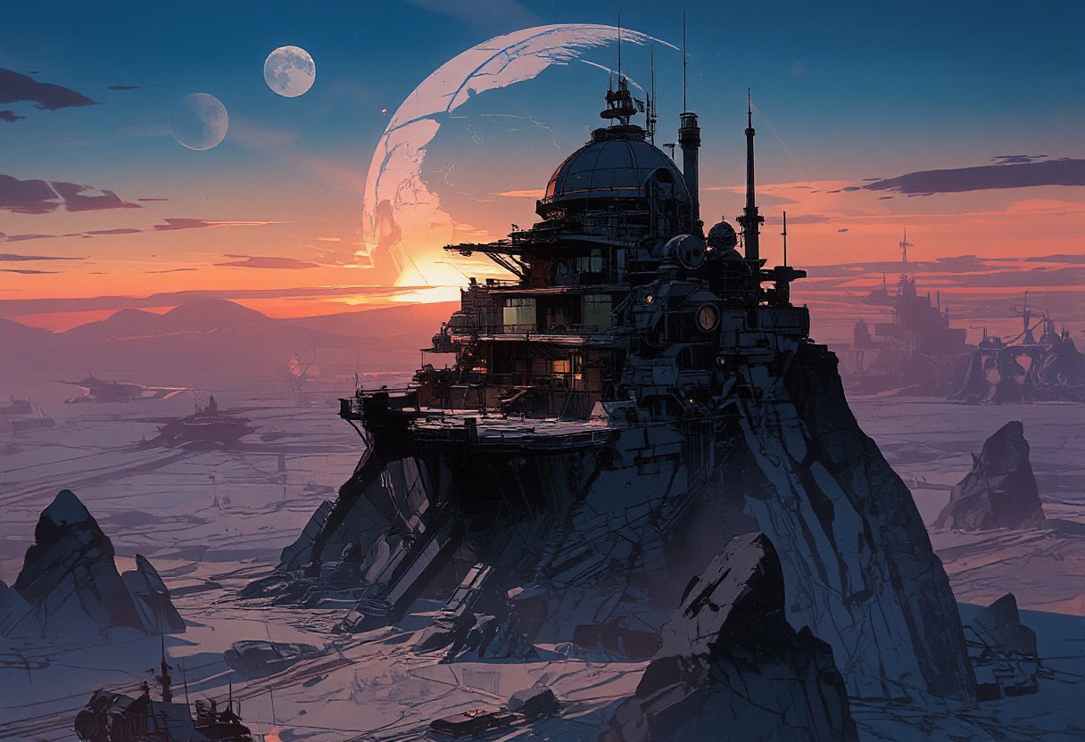 Seen from the sky, a futuristic city stands in the middle of a vast icy expanse. The scene takes place on another planet, as two moons are visible in the sky. The city is perched on a massive rocky spur, its architecture sleek and harmonious, made of glass and steel. A large building with a grand dome overlooks the city, and communication antennas are scattered throughout. Space traffic is visible, with a massive spaceship above us and another below, docking at the city's elevated astroport. Several platforms extend from the city's rocky foundation. In the distance, two other cities can be seen, also perched on rocky spurs. Mining vehicles move across the icy terrain, traveling between the cities. The cities are surrounded by an immense frozen desert, with occasional jagged rocks emerging from the ice. The sky is brightly illuminated as the sun sets, casting a stunning blend of deep blues and warm oranges. The atmosphere is nocturnal, with breathtaking hues of twilight and early evening.