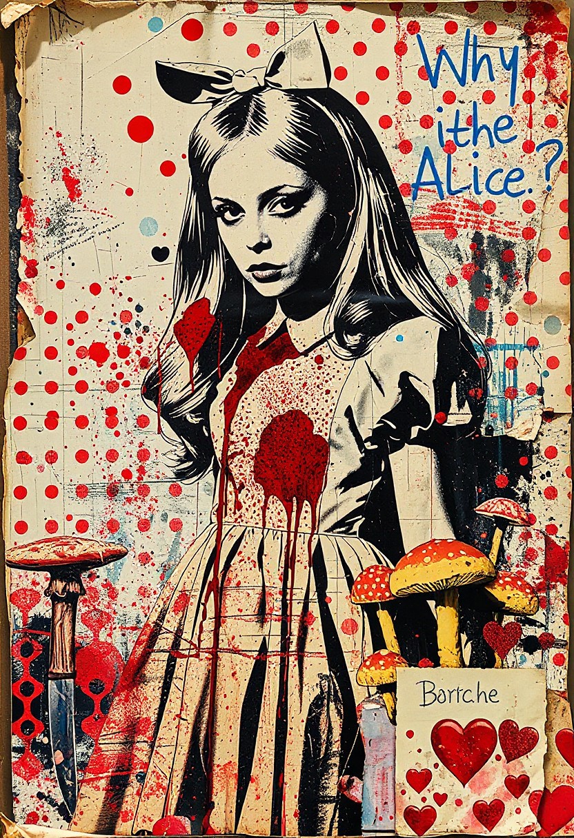 A pop art style of Butcher Billy mixed media collage artwork. Deconstructed, provocative, surreal, intense and chaotic composition. Street art textures, overlapping layers and vibrant retro colours. A distressed photocopy print of a magazine image of Alice in Wonderland in a latex outfit covered in blood. Print errors, halftone dots. grungy print registration errors. Overlaying this are multiple layers of vintage storybook images, hand-drawn shapes and patterns, bold paint splashes. Next are layered sections of repetitive brightly coloured dots are spraypainted in Yayoi Kusama style - smears and spray. Paint splattered and dripping. Torn magazine photos of knives and toadstools glued to the layers. These partially hide sections of the images below. On the top layer are rough hand-drawn shapes, abstract patterns and love hearts scrawled heavy-handedly in blue biro and Sharpie marker. Text: "Why Alice?"