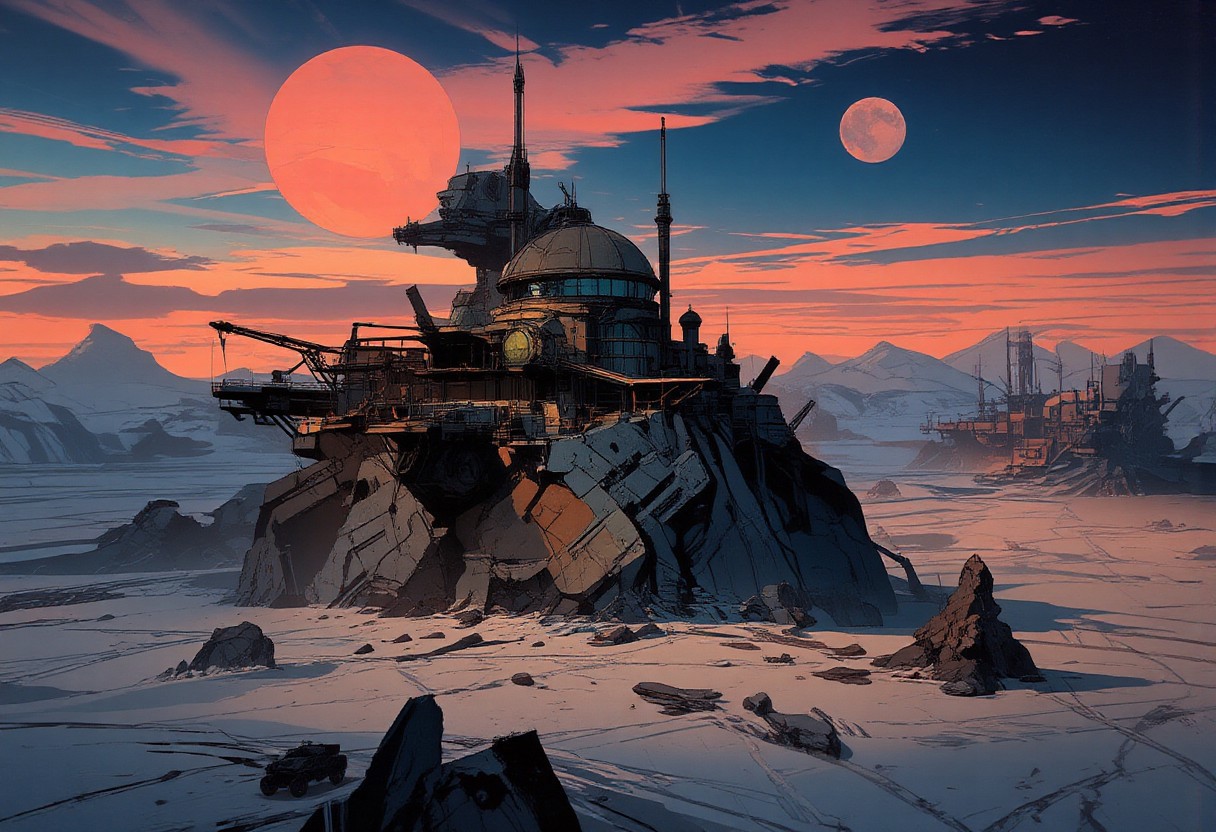 Seen from the sky, a futuristic city stands in the middle of a vast icy expanse. The scene takes place on another planet, as two moons are visible in the sky. The city is perched on a massive rocky spur, its architecture sleek and harmonious, made of glass and steel. A large building with a grand dome overlooks the city, and communication antennas are scattered throughout. Space traffic is visible, with a massive spaceship above us and another below, docking at the city's elevated astroport. Several platforms extend from the city's rocky foundation. In the distance, two other cities can be seen, also perched on rocky spurs. Mining vehicles move across the icy terrain, traveling between the cities. The cities are surrounded by an immense frozen desert, with occasional jagged rocks emerging from the ice. The sky is brightly illuminated as the sun sets, casting a stunning blend of deep blues and warm oranges. The atmosphere is nocturnal, with breathtaking hues of twilight and early evening.