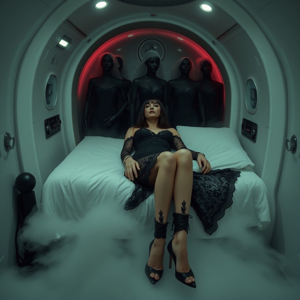 Ethereal, slender, ultra thin waist, tall, raven-haired Norwegian socialite wearing stunning black lace trouser suite and high heels, laying inside weird aliem MRT-like braimwashing machine, hand cuffed to the bed, ankles cuffed to the bed. Restrained. Looking to the camera. Eeire fog from the floor. A coterie of black, Victorian-era mannequins, draped in tattered, luxurious wedding black bridal ball-gowns. Horror. Alien spaceship mind control chamber. Sci-fi. Horror. Total recall