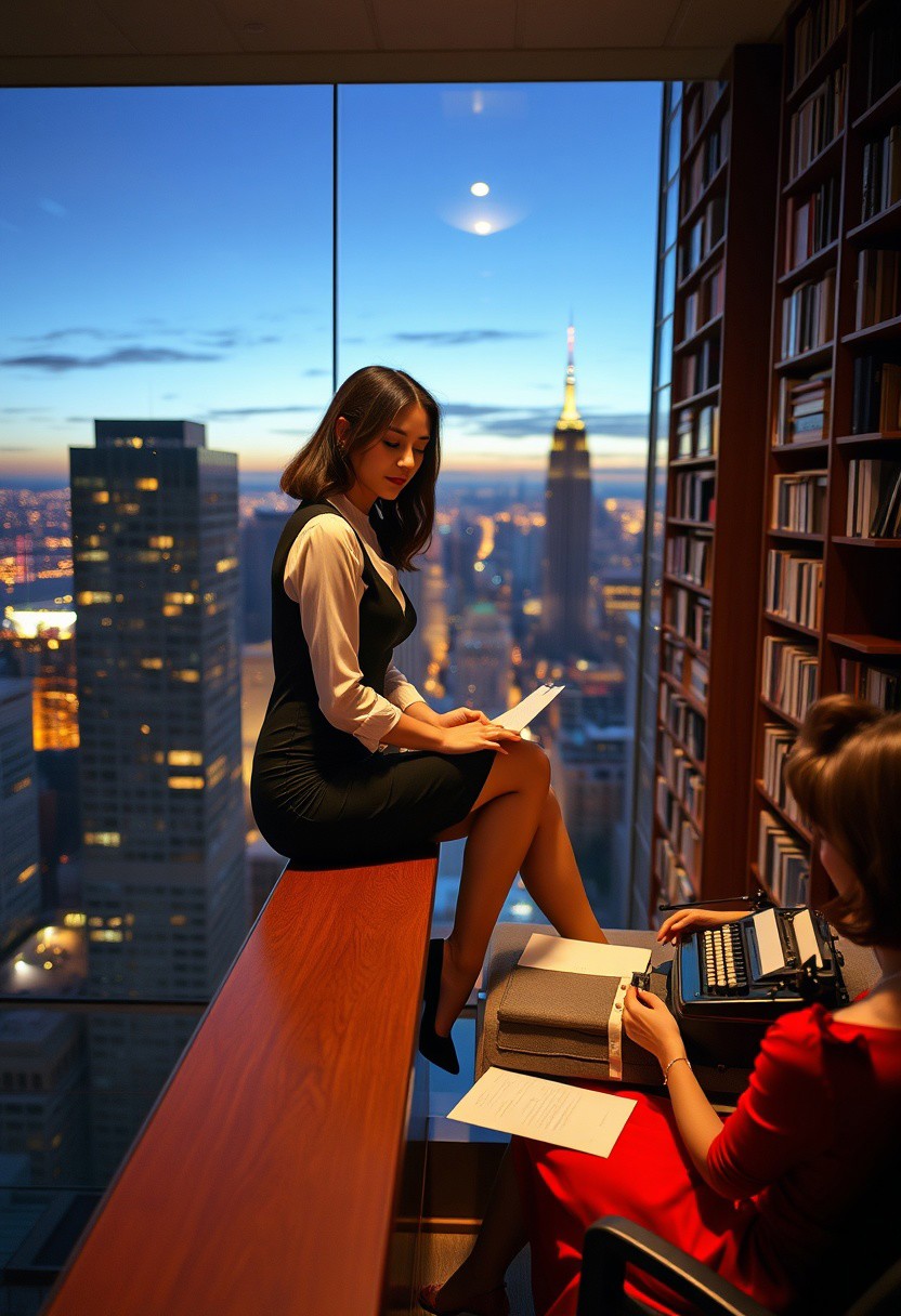 A captivating scene of a secretary in a sleek, form-fitting black dress, sitting on the edge of a high-rise office desk, overlooking the city skyline at dusk. The ambiance is charged with a soft, mysterious allure. Photo by Helmut Newton, Canon EOS-1D X, 50mm f/1.2.2. Envision a vibrant office setting where a secretary, clad in a classic white blouse and pencil skirt, is organizing files with a subtle smile. The background buzzes with the energy of a busy workday. Photograph by Cindy Sherman, Nikon D850, 85mm f/1.4.3. A serene, sunlit room features a secretary in a vintage-inspired red dress, typing away on an old typewriter, surrounded by towering bookshelves. The scene exudes a nostalgic, dreamy quality. Photo by Annie Leibovitz, Sony Alpha A7R IV, 35mm f/1.4.4.