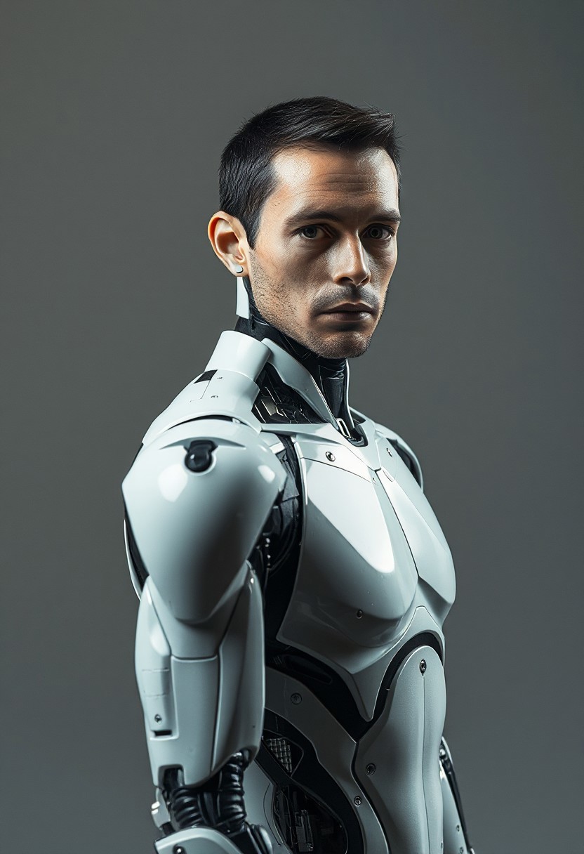 photo portrait of a man stands in front of camera, body slightly turned, looks into camera, high detailed, neutral background, with tiny details of a robot (andriod) but more as a human, realistic photo