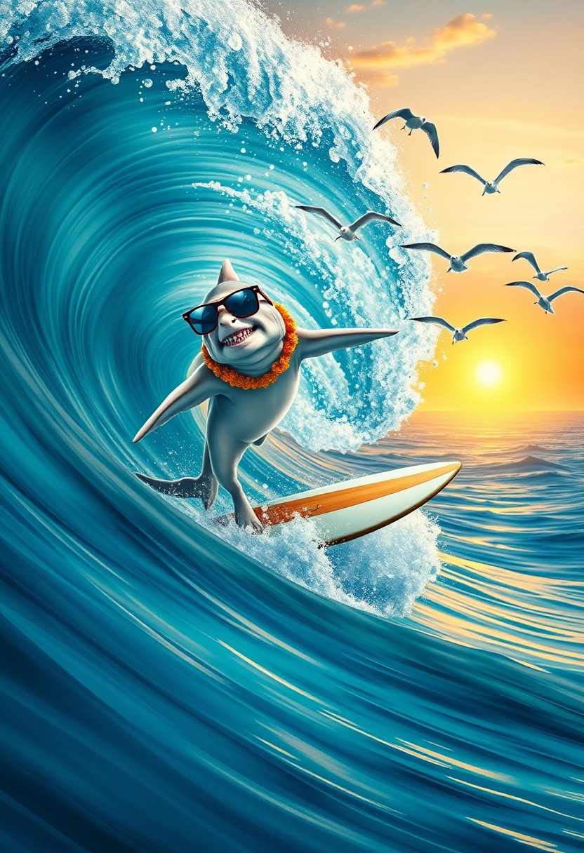 A bright white shark, wearing oversized mirrored sunglasses and a tropical flower necklace, balances expertly on a surfboard, cutting through the crest of an enormous wave. The water is a swirling mix of blues and greens, foamy spray frozen in time as it arcs around the sharks outstretched fins. A small crowd of bewildered seagulls watches mid-flight, their heads tilted in disbelief. The horizon stretches endlessly in the background, where the setting sun casts a golden glow across the oceanas surface.<lora:XRSTYLE_FLUX:0.5><lora:black_fantasy_1.0:0.5><lora:FluxDFaeTasticDetails:0.7>