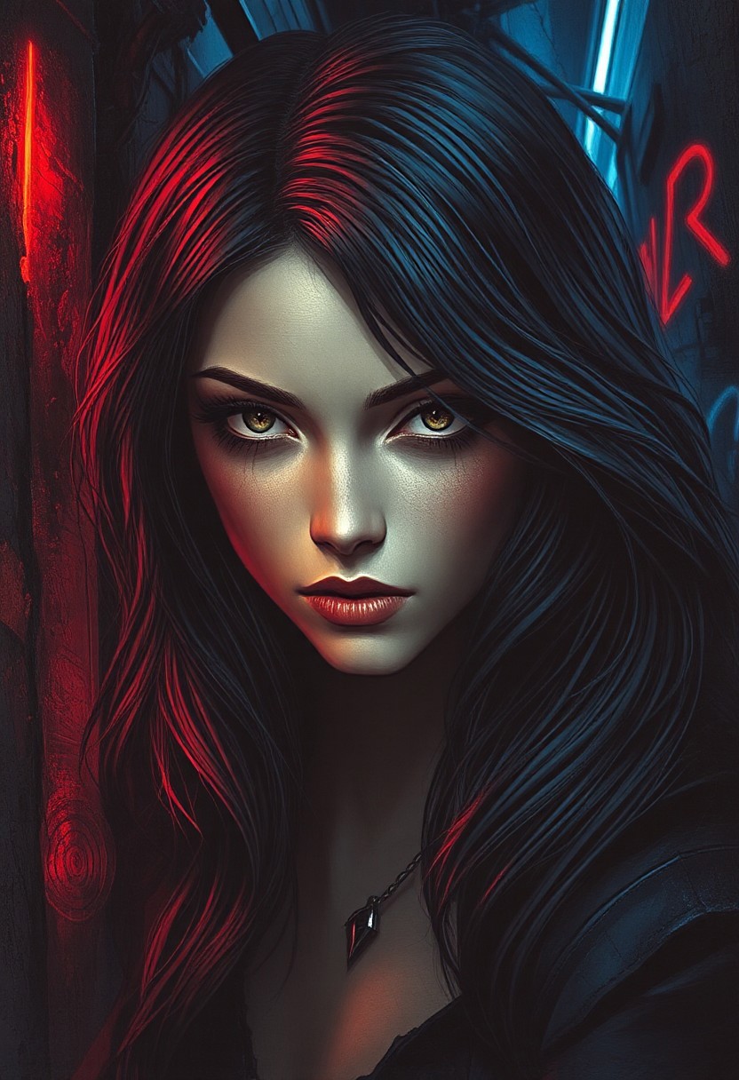 portrait (9:16) Draw a surrealism image of a gorgeous , showcasing her dynamic three-quarter close-up with vibrant pastel lighting. She has long brunette wavy hair, pale skin, and bright piercing eyes, smiling mysteriously in a neon-lit slum alley with dramatic neon signs., <lora:- Flux1 - vanta_black_V2.0:1> <lora:DnDDarkestFantasy:1> <lora:FluxF4ngs:1>, tiny tits