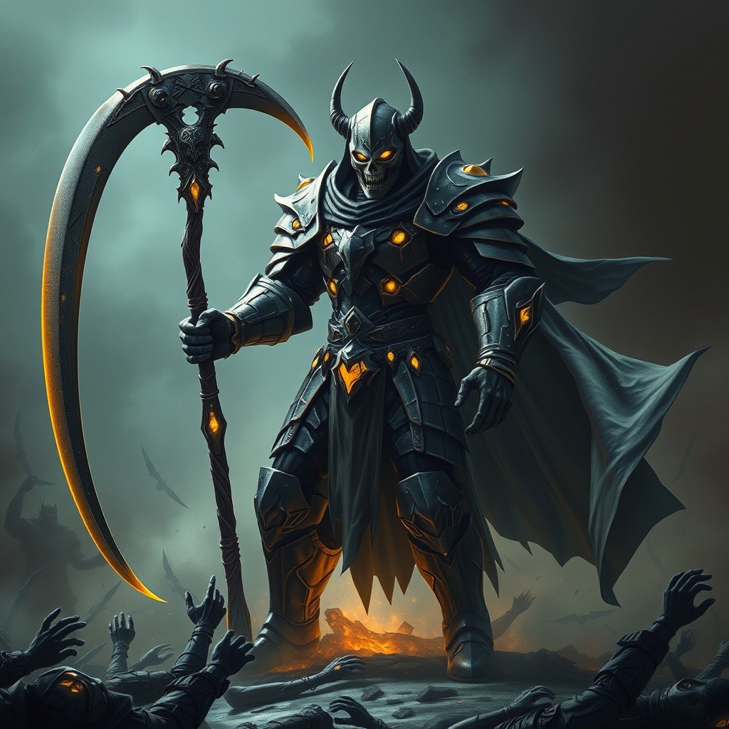 Large figure clad in segmented armor from head to toe. On a battle field surrounded by defeated foes. Wide angle, full body shot. Helmet with skull mask design with glowing yellow eyes, wielding a large two headed scythe and a flowing shadowy cape, his armor decorated with glowing yellow crystals. Light dim, futuristic, gothic.